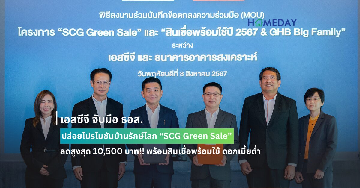 เอสซีจี ผู้นำด้านวัสดุก่อสร้างเพื่อการอยู่อาศัยยั่งยืน จับมือพันธมิตร ธนาคารอาคารสงเคราะห์ (ธอส.) จัดแคมเปญพิเศษ “SCG Green Sale” ส่งเสริมให้เจ้าของบ้านยุคใหม่เข้าถึงนวัตกรรมสีเขียว มีบ้านสวยที่ประหยัดพลังงาน ผ่านโปรแกรมสมาชิก SCG Family โดยมอบส่วนลดสูงสุดถึง 10,500 บาทให้แก่ลูกค้า ธอส. และลุ้นรางวัลมูลค่า 1.5 ล้านบาท เมื่อซื้อสินค้าวัสดุก่อสร้างของเอสซีจี โดยสามารถกู้ซื้อสินค้าผ่าน “สินเชื่อพร้อมใช้ปี 2567” ได้ทันที ดอกเบี้ยต่ำ คงที่ 3 ปี ที่นำเสนอโดย ธอส. โดยได้มีการลงนามบันทึกความร่วมมือ (MOU) ไปเมื่อวันที่ 8 สิงหาคมที่ผ่านมา