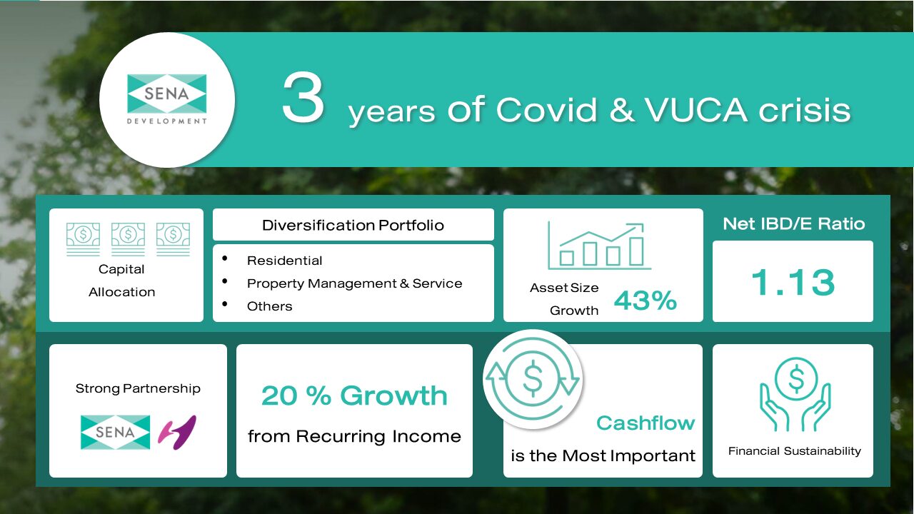 เสนาชี้ โลกยุคผันแปรอย่างรวดเร็ว ปรับตัวพร้อมสู้ทุกวิกฤต ชูกลยุทธ์ขยายความร่วมมือกับพันธมิตรที่แข็งแกร่ง บริหารพอร์ท เพิ่มประสิทธิภาพการดำเนินงาน และสร้างรายได้สูงขึ้น ส่งผลขนาด Asset รวมโตก้าวกระโดดสูงกว่า 50,000 ล้าน ขณะที่ตัวเลข Net IBD/E สวนทางต่ำลงที่ 1.13 เท่านั้น สะท้อนภาพพื้นฐานทางการเงินที่แข็งแกร่ง พร้อมปรับโครงสร้างสัดส่วนรายได้จากโครงการที่พักอาศัย และธุรกิจบริการเป็น 80/20 และรายได้จากการดำเนินงานสามารถเปลี่ยนเป็นกระแสเงินสดในการดำเนินงานได้ 100% พร้อมมีสินค้าใน Portfolio อีก 82,000 ล้าน