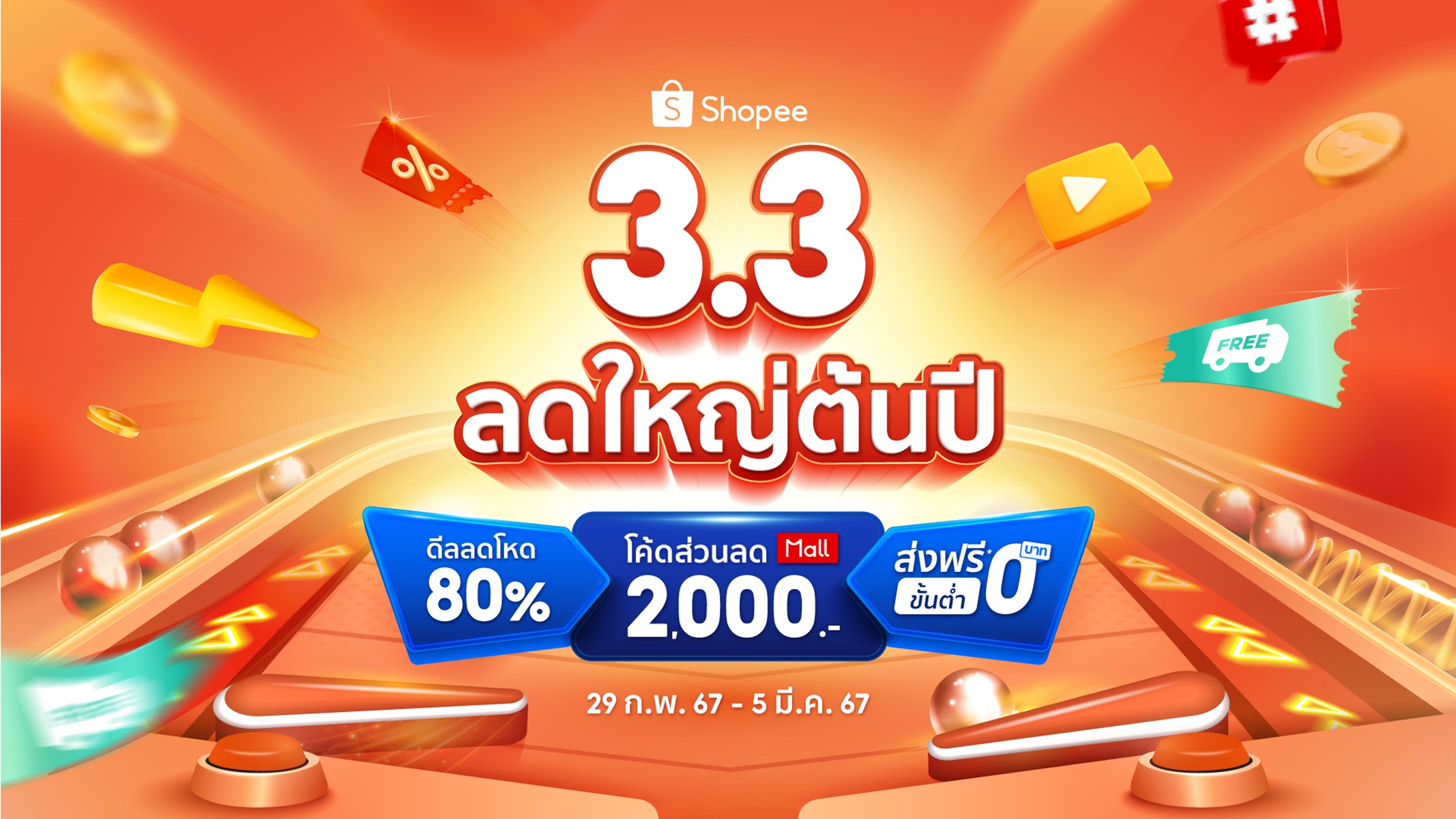ช้อปปี้ ในฐานะอีคอมเมิร์ซเบอร์ 1 ครองใจนักช้อปชาวไทย เรายังคงเดินหน้าศึกษาพฤติกรรมของนักช้อปอย่างลึงซึ้งเพื่อมอบการช้อปปิ้งที่สนุกกว่า คุ้มค่ากว่า และสินค้าที่ครบครันบนช้อปปี้ ดังนั้น วันนี้ ช้อปปี้เปิดศักราชใหม่ต้อนรับปีมังกรด้วย แคมเปญ 3.3 ลดใหญ่ต้นปี ที่ครั้งนี้เราก็จัดเต็มกว่าที่เคยผ่านเหล่าดีลและโปรโมชันสุดพิเศษจากเหล่าร้านค้าและแบรนด์ดังชั้นนำบน Shopee Mall ไม่ว่าจะเป็น ดีลลดโหด 80% ในหลากหลายหมวดหมู่, สินค้าถูกสุดเที่ยงคืน – ตีสองและเพิ่มรอบเที่ยงวัน-สองโมง, โค้ดส่วนลด Shopee Mall 2,000 บาท โปรโมชันส่งฟรีขั้นต่ำ 0 บาทและอีกคับคั่ง ตั้งแต่วันที่ 29 กุมภาพันธ์ – 5 มีนาคม 2567