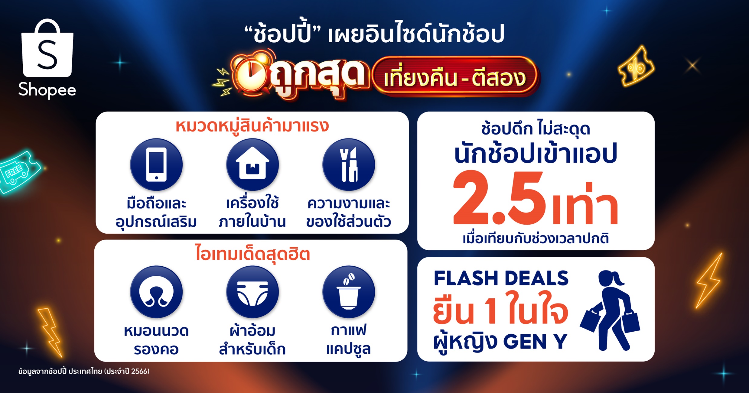 • ในปี 2566 พบว่า หมอนนวดรองคอ, ผ้าอ้อมเด็ก, กาแฟแคปซูล เป็นกลุ่มสินค้าที่ฮิตติดเทรนด์ในช่วง “ถูกสุดช่วงเที่ยงคืนถึงตีสอง”