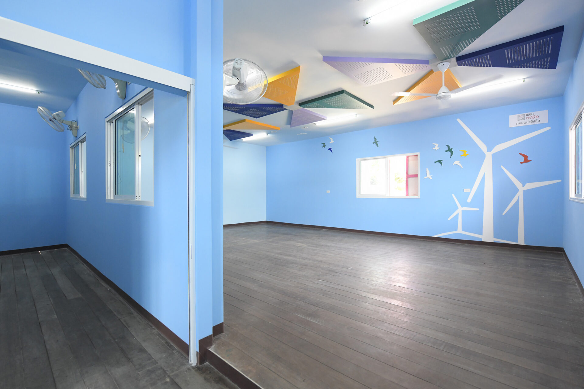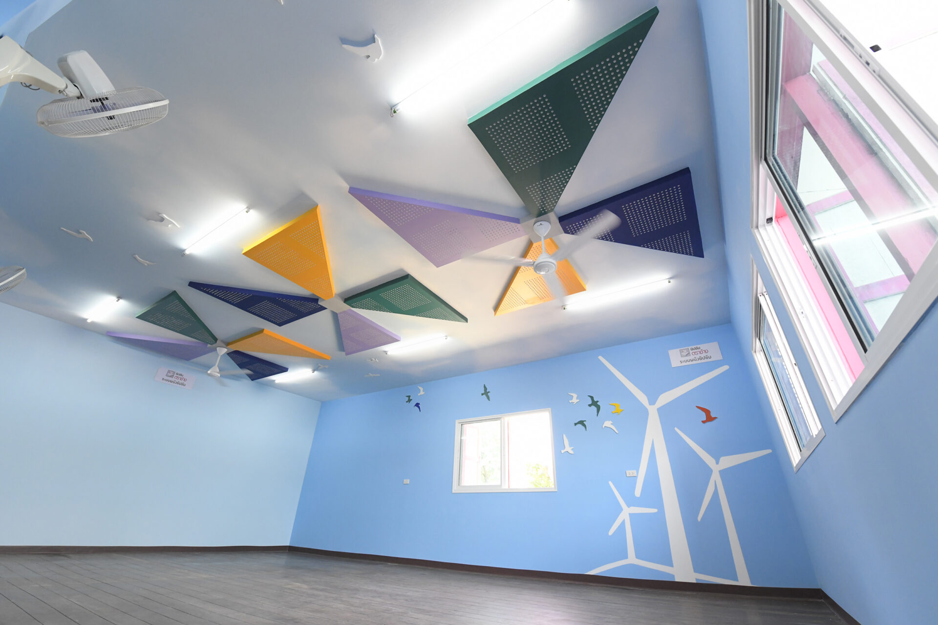 จากความตั้งใจที่ต้องการสร้างรอยยิ้มและความสุขให้กับน้อง ๆ นักเรียน จึงเป็นที่มาของแรงบันดาลใจสู่การออกแบบฝ้าเพดานเป็นลวดลายผสมผสานคล้ายกังหันลม โดยฝ้าเพดานบริเวณห้องเรียนของน้อง ๆ ถูกติดตั้งด้วยแผ่นยิปซัมมอยส์บล็อค ตราช้าง (ทนชื้น) และนำแผ่นยิปซัมเอคโค่บล็อค ตราช้าง (ลดเสียงสะท้อน) มาแกะลวดลายเป็นกังหันสีเขียว เหลือง ม่วง ก่อนนำมาประดับบริเวณฝ้าเพดาน เติมความสดใสให้กับห้องเรียนของโรงเรียนวัดทำนบ จังหวัดราชบุรี
