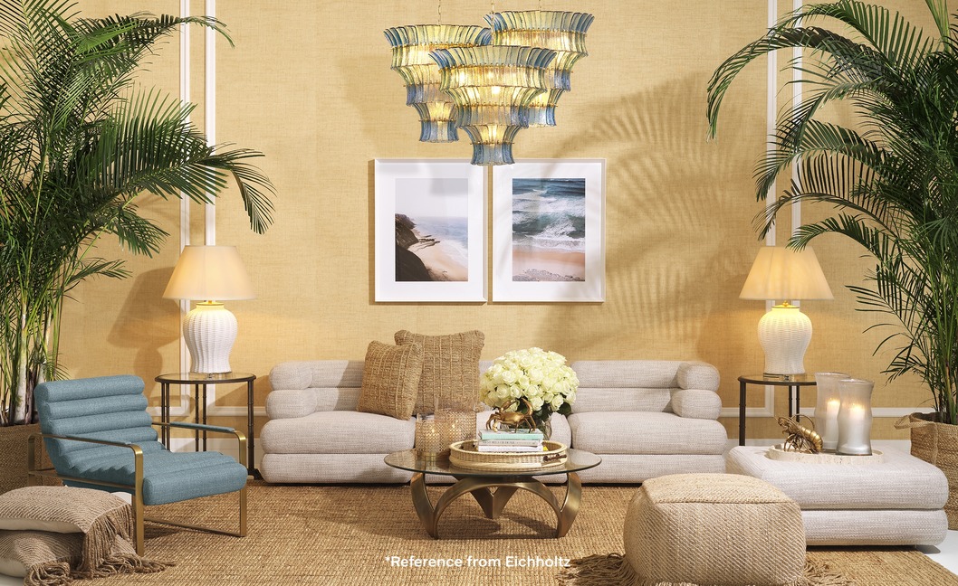 • โคมไฟระย้า Eichholtz Toscano ทำจากแก้วเป่ามือพร้อมดีไซน์โค้งตามธรรมชาติและรายละเอียดทองเหลืองโบราณ ถูกจัดวางอย่างมีศิลปะในห้องนั่งเล่นเพื่อเป็นจุดเด่น