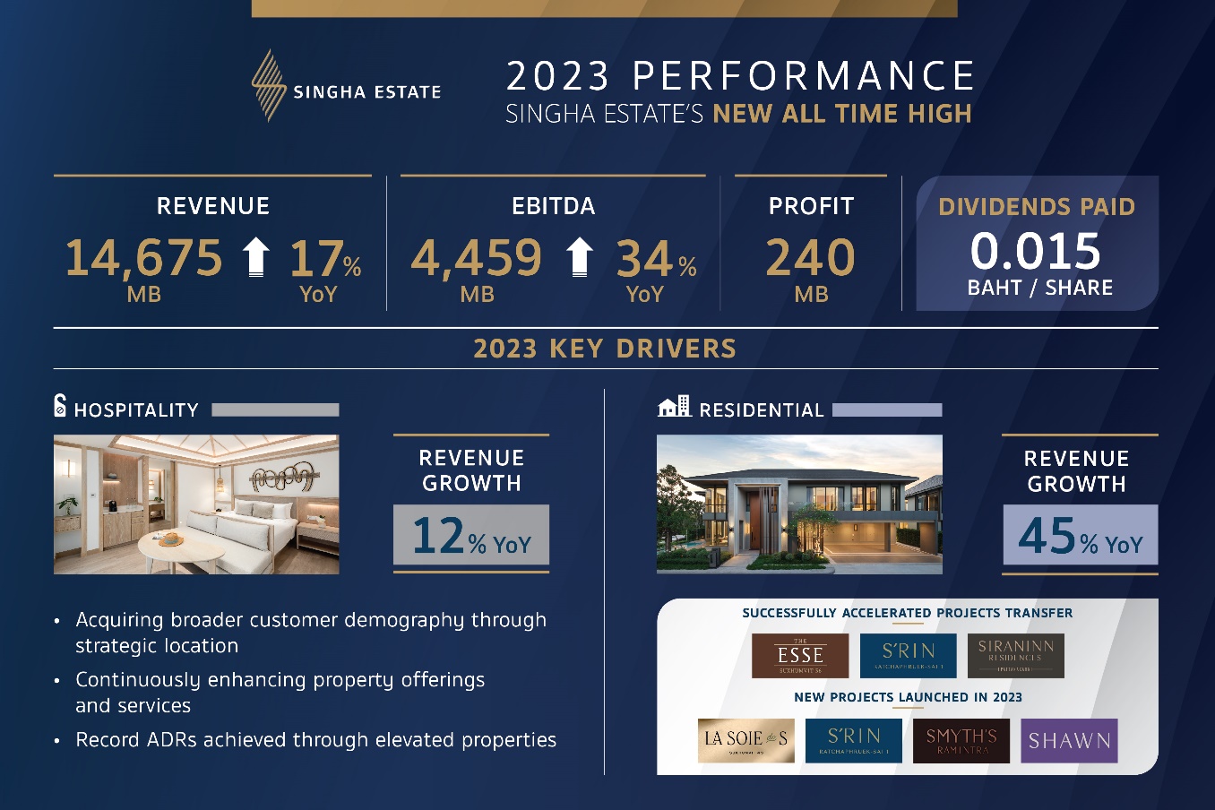 สิงห์ เอสเตท รายงานรายได้รวมจากการขายและการบริการสำหรับปี 2566 จำนวน 14,675 ล้านบาท โดยรายได้จากการขายอสังหาริมทรัพย์ เติบโตเด่นถึง 42% ด้วยแรงส่งสำคัญจากการเปิดตัว 5 โครงการ มูลค่ารวม 10,000 ล้านบาท มั่นใจปี 2567 โตแรงจากสินค้าพร้อมขายในระดับสูง ขณะที่รายได้จากธุรกิจให้บริการปรับตัวเพิ่มขึ้น 11% จากอุตสาหกรรมท่องเที่ยวที่เติบโต ซึ่งส่งผลให้ระดับรายได้เฉลี่ยต่อห้อง (RevPAR) ของโรงแรมในปี 2566 เพิ่มขึ้นถึง 23% แรงส่งสำคัญคือการปรับอัตราค่าห้องพักเฉลี่ย (ADR) ที่โดดเด่นจากการปรับปรุงโรงแรมตามแผนและความสามารถในการดึงดูดลูกค้าตลาดใหม่