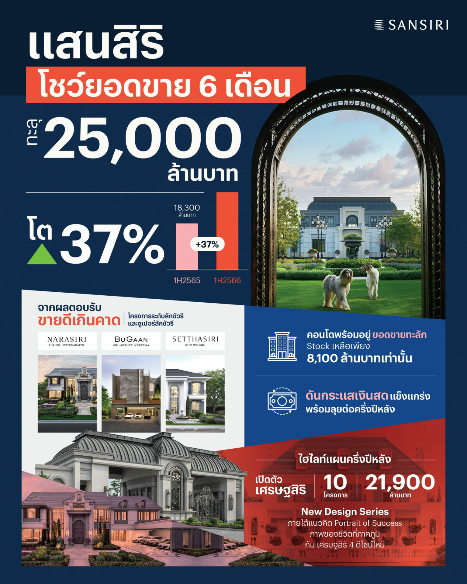 อย่างไรก็ดี แสนสิริ ไดมองล่วงหน้าถึงสถานการณ์และมีความพร้อมรองรับความผันผวนของภาพรวมตลาดอสังหาริมทรัพย์ต่างๆ ไว้แล้ว จึงวางกลยุทธ์ต่างๆ ตามความเหมาะสม ส่งผลให้สามารถสร้างผลงานเป็นที่น่าพอใจ โดยในครึ่งปีแรก แสนสิริสามารถสร้างยอดขายได้ถึง 25,000 ล้านบาท เติบโตขึ้นถึง 37% เทียบกับช่วงเดียวกันของปีที่ผ่านมา