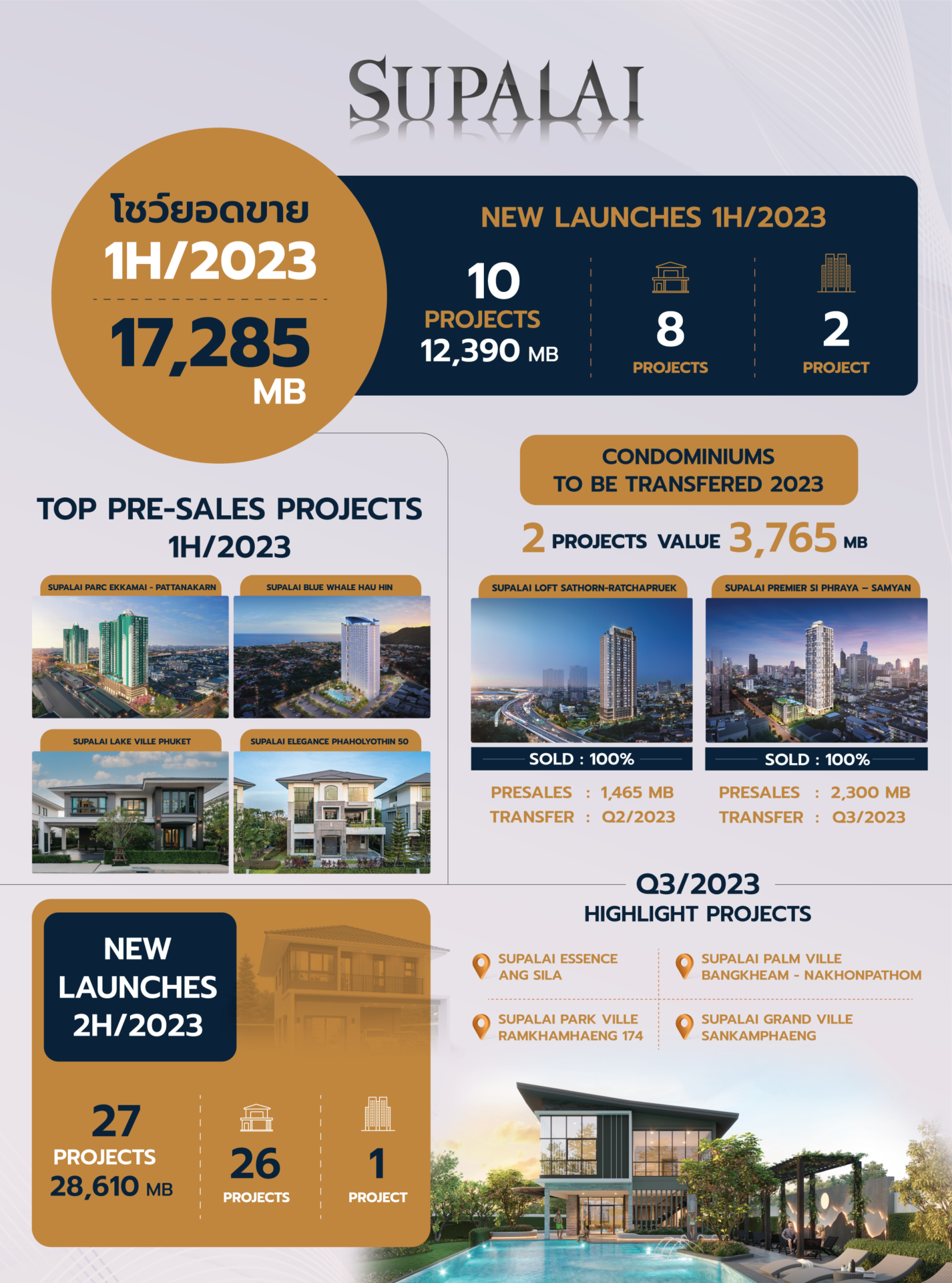 สำหรับครึ่งปีหลัง 2566 บริษัทฯ เดินเครื่องพัฒนาโครงการใหม่รวม 27 โครงการ มูลค่ารวม 28,610 ล้านบาท เปิดตัวโครงการแนวราบ 26 โครงการ และคอนโดมิเนียม 1 โครงการ โดยมีการออกแบบผลิตภัณฑ์และเปิดตัวแบรนด์ใหม่ การพัฒนาคุณภาพสินค้าและบริการให้ดีขึ้นอย่างต่อเนื่อง พร้อมลุยเปิดตลาดอสังหาฯ ในจังหวัดใหม่ๆ ในทำเลศักยภาพ สำหรับโครงการแนวราบเปิดเพิ่ม 4 จังหวัดใหม่ คือ นครปฐม ลำปาง ราชบุรี และจันทบุรี และคอนโดมิเนียมแบรนด์ใหม่อีกด้วย เพื่อรองรับความต้องการของลูกค้า ซึ่งจะช่วยหนุนยอดขายให้เติบโตได้ตามเป้าหมาย อีกทั้งไตรมาส 3 ยังเตรียมพร้อมโอนฯ ห้องชุดให้ลูกค้ากับโครงการศุภาลัย พรีเมียร์ สี่พระยา-สามย่าน ทำให้บริษัทฯ มั่นใจว่าจะได้รับกระแสตอบรับที่ดีจากการโอนฯ ของลูกค้าเช่นกัน และคาดว่าจะทยอยโอนกรรมสิทธิ์ได้ครบภายในปี 2566 ช่วยผลักดันรายได้จากการขายอสังหาริมทรัพย์เป็นไปตามเป้าหมายที่ตั้งไว้