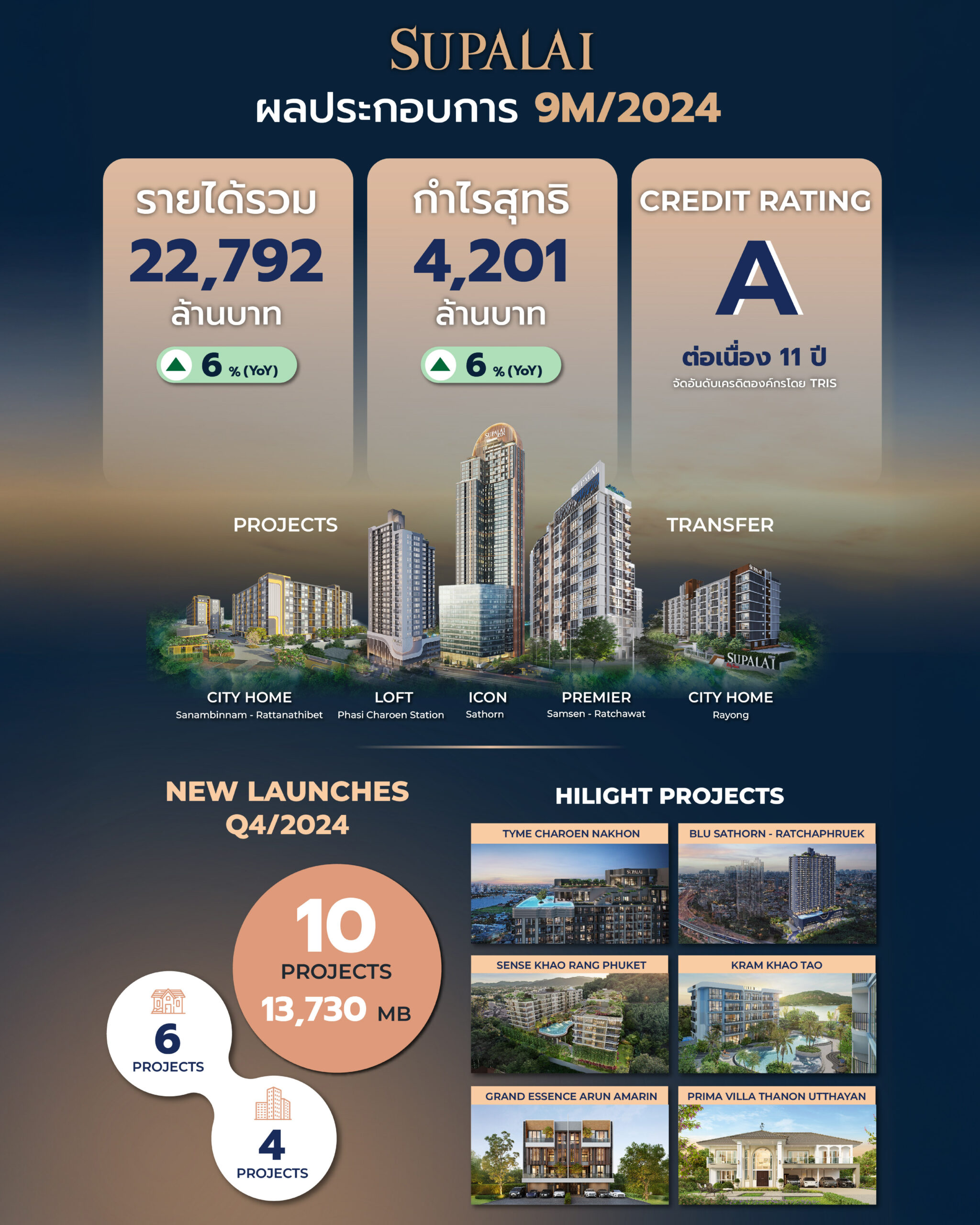 นายไตรเตชะ ตั้งมติธรรม กรรมการผู้จัดการ บริษัท ศุภาลัย จำกัด (มหาชน) กล่าวว่า ภาพรวมผลการดำเนินงานในช่วง 9 เดือนของปี 2567 ถือว่าประสบความสำเร็จทั้งด้านรายได้และกำไร โดยบริษัทฯ สามารถรักษาระดับการเติบโตได้ตามแผนที่วางไว้ โดยกวาดรายได้รวมสูงถึง 22,792 ล้านบาท เพิ่มขึ้น 6% จากช่วงเวลาเดียวกันของปี 2566 และรายได้รวมของไตรมาส 3/2567 เท่ากับ 9,985 ล้านบาท เพิ่มขึ้น 39% เมื่อเทียบกับไตรมาส 3/2566 ซึ่งรายได้หลักสำหรับงวด 9 เดือน ปี 2567 มาจากการโอนกรรมสิทธิ์อสังหาริมทรัพย์ทั้งในกรุงเทพฯ ปริมณฑล และภูมิภาค โดยแบ่งเป็นรายได้โครงการแนวราบ 64% และโครงการคอนโดมิเนียม 36% ซึ่งได้รับแรงหนุนจากการเปิดตัวโครงการใหม่ และกระแสตอบรับที่ดี ในกลุ่มสินค้าสร้างเสร็จพร้อมเข้าอยู่ อีกทั้งในช่วงไตรมาส 1-3 ได้มีการโอนกรรมสิทธิ์คอนโดมิเนียมที่สร้างเสร็จ เริ่มทยอยรับรู้รายได้จาก 5 โครงการใหม่ มูลค่ารวมกว่า 16,000 ล้านบาท ได้แก่ ศุภาลัย ไอคอน สาทร, ศุภาลัย พรีเมียร์ สามเสน-ราชวัตร, ศุภาลัย ลอฟท์ สถานีภาษีเจริญ, ซิตี้โฮม สนามบินน้ำ-รัตนาธิเบศร์ และซิตี้โฮม ระยอง นอกจากนี้บริษัทฯ ยังมีสินค้าสร้างเสร็จพร้อมเข้าอยู่ในมืออยู่อีก 28,000 ล้านบาท ซึ่งเป็นอีกหนึ่งตัวชี้วัดที่สำคัญสะท้อนถึงความต้องการของตลาด Real Demand ที่ถือเป็นคีย์ไดรฟ์สำคัญในการเติบโตทางรายได้และกำไรอย่างแข็งแกร่ง