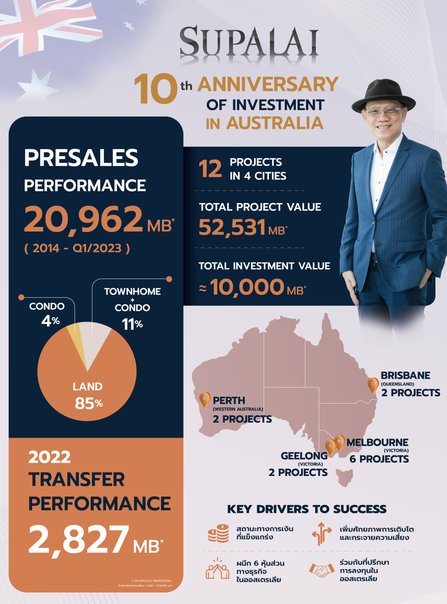 ฉลองครบรอบ 10 ปี ศุภาลัย โชว์ศักยภาพการลงทุนในออสเตรเลีย สร้างปรากฏการณ์ยอดขายรวม 12 โครงการ มูลค่า 894 ล้านดอลลาร์ออสเตรเลีย หรือ 20,962 ล้านบาท