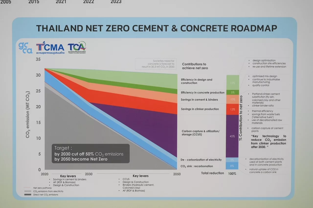 ทั้งนี้ อุตสาหกรรมปูนซีเมนต์มุ่งมั่นที่จะสนับสนุนนโยบายลดก๊าซเรือนกระจกของประเทศอย่างต่อเนื่อง มีการจัดทำ Thailand Net Zero Cement and Concrete Roadmap 2050 ร่วมกับสมาคมคอนกรีตแห่งประเทศไทย โดยการสนับสนุนของ Global Cement and Concrete Association (GCCA) ภายใต้ Roadmap ประเมินว่า จะสามารถลดการปล่อยก๊าซเรือนกระจกได้ 30.3 ล้านตัน CO2 โดยลดลงได้ครึ่งหนึ่งภายในปี 2573 ซึ่งสอดคล้องกับเป้าหมาย Thailand NDC และเข้าสู่ Net Zero ในปี 2593 ซึ่งสอดคล้องกับทิศทางระดับโลก