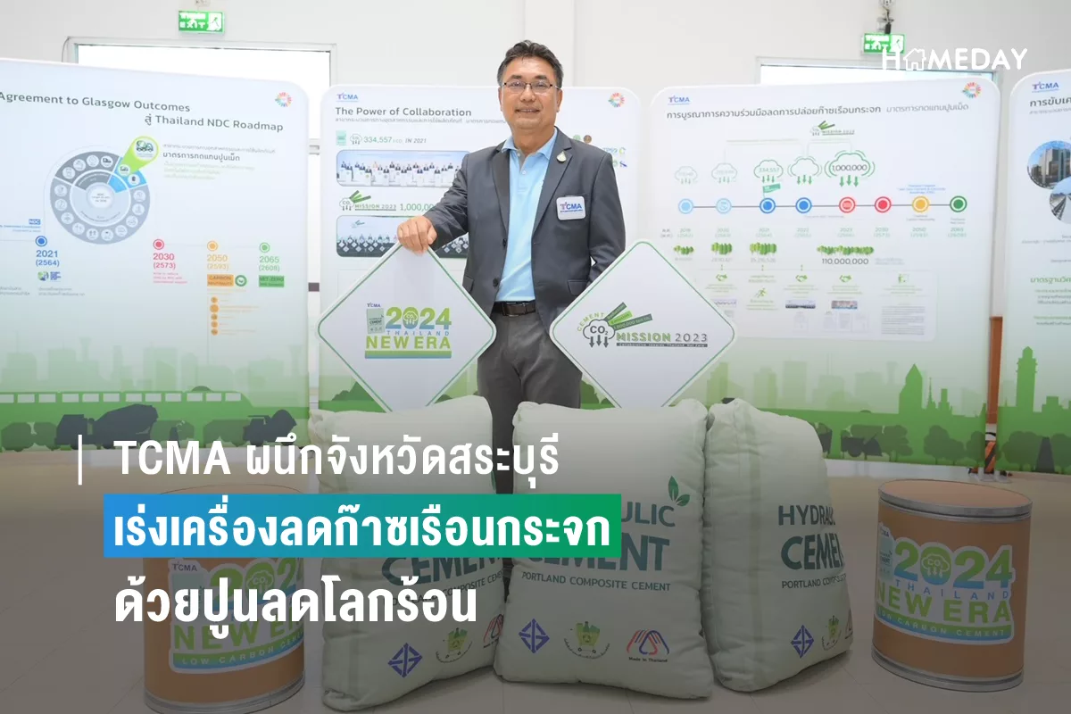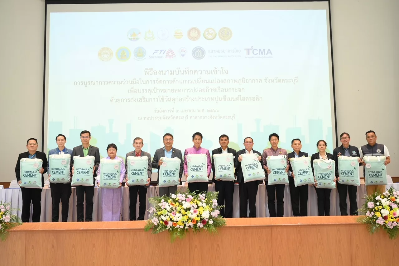 สมาคมอุตสาหกรรมปูนซีเมนต์ไทย (TCMA) จับมือ ผู้ว่าฯ จังหวัดสระบุรี นำทัพภาครัฐ องค์กรปกครองส่วนท้องถิ่น ภาคเอกชน-ผู้ประกอบการ บูรณาการความร่วมมือจัดการด้านการเปลี่ยนแปลงสภาพภูมิอากาศ จังหวัดสระบุรี ประกาศความพร้อมเดินหน้าใช้งานปูนลดโลกร้อน (ปูนซีเมนต์ไฮดรอลิก) ในทุกงานก่อสร้างของจังหวัด เพื่อมีส่วนร่วมสำคัญในความสำเร็จลดการปล่อยก๊าซเรือนกระจกของประเทศ เป้าหมาย 1,000,000 ตันคาร์บอนไดออกไซด์ ภายในปี 2566