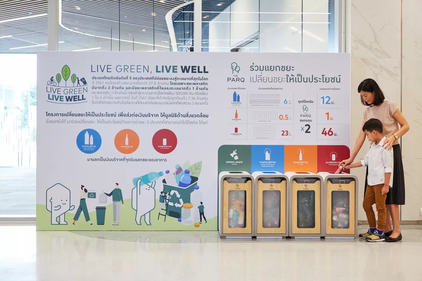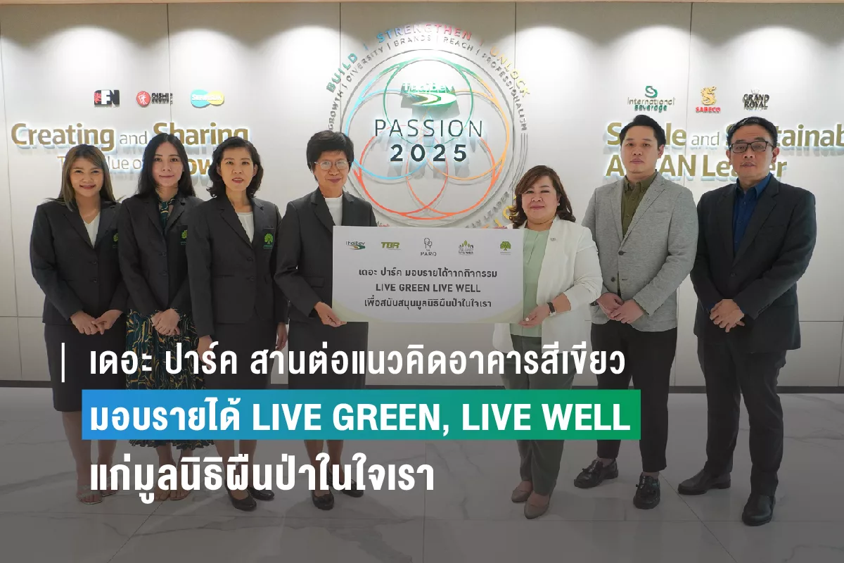 โครงการ LIVE GREEN, LIVE WELL เป็นความร่วมมือระหว่าง เดอะปาร์คและ ไทยเบฟเวอเรจ รีไซเคิล (TBR) ชูแนวคิด “ร่วมแยกขยะ เปลี่ยนขยะให้เป็นประโยชน์” ปลูกต้นกล้าแห่งความเชื่อที่ว่า “ขยะก็มีคุณค่า” รณรงค์ให้ผู้เช่าอาคารสำนักงาน ร้านค้า ร้านอาหารชั้นนำ และผู้ใช้บริการทั่วไปร่วมกันแยกและเพิ่มคุณค่าให้กับขยะบรรจุภัณฑ์ ทั้งหมด 3 ประเภทที่สามารถนำไปรีไซเคิล ได้แก่ ขวดพลาสติกใส กระป๋องอลูมิเนียม และขวดแก้ว มาเปลี่ยนเป็นเงินบริจาคสนับสนุนมูลนิธิผืนป่าในใจเรา พร้อมกันนี้ เดอะ ปาร์ค ยังได้สมทบทุนเพิ่มเป็นจำนวนเงินอีกหนึ่งเท่าของรายได้จากโครงการฯ ทำให้ยอดบริจาคทั้งหมดเทียบเท่ากับการเพิ่มพื้นที่สีเขียวถึง 187,200 ตร.ม. โดยมีวัตถุประสงค์เพื่อสนับสนุนการดำเนินงานของมูลนิธิฯ ส่งเสริมและสนับสนุนการอนุรักษ์สิ่งแวดล้อมและทรัพยากรธรรมชาติ ด้วยการฟื้นฟู ดูแลรักษาผืนป่า ตลอดจนเพิ่มพื้นที่สีเขียวในทุกพื้นที่ของประเทศไทย เพื่อแก้ไขปัญหามลภาวะให้สมดุลกับสิ่งแวดล้อมทางธรรมชาติ รวมถึงอนุรักษ์สัตว์ป่าสงวนที่ใกล้สูญพันธ์ เพื่อการพัฒนาทางด้านเศรษฐกิจ สังคม และสิ่งแวดล้อมอย่างยั่งยืน นอกจากนี้ โครงการ LIVE GREEN, LIVE WELL ยังสนับสนุนกระบวนการการจัดการขยะแบบครบวงจร ครอบคลุมองค์ประกอบต่าง ๆ ตั้งแต่การคัดแยก รวบรวม และเข้าสู่กระบวนการรีไซเคิลต่อไป รวมถึงการเปลี่ยนเศษอาหารเหลือเป็นปุ๋ยหมักอินทรีย์