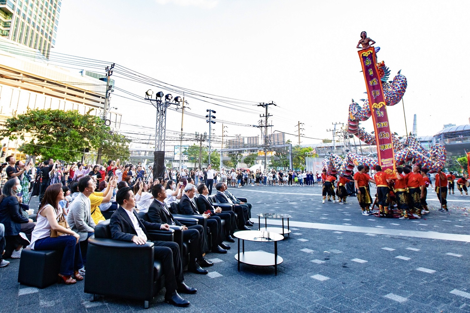 ภายในงานได้รับเกียรติจาก นายยุทธพันธ์ ไชยทิพย์ รองผู้อำนวยการกองส่งเสริมกิจกรรม การท่องเที่ยวแห่งประเทศไทย นายประเทืองวิทย์ ดีใจ ผู้อำนวยการเขตดินแดง และน้ำฟ้า ธัญญภัสร์ ดาราศิลปินนักแสดง พร้อมการแสดงโชว์ชุดพิเศษ “มังกรหยก” ในรูปแบบการแสดงเชิดขบวนมังกรทอง ยาวกว่า 32 เมตร รวมถึงแขกรับเชิญคนพิเศษที่สายมูหลายคนต่างเฝ้ารอ หมอช้าง ทศพร ศรีตุลา ที่มาร่วมพูดคุยถึงเรื่องราวของดวงราศี พร้อมเผยวิธีเสริม สิริมงคลรับโชคใหญ่ในปีมังกรและการไหว้บูชาเพื่อเป็นแนวทางชีวิตรับต้นปีที่กำลังจะมาถึง