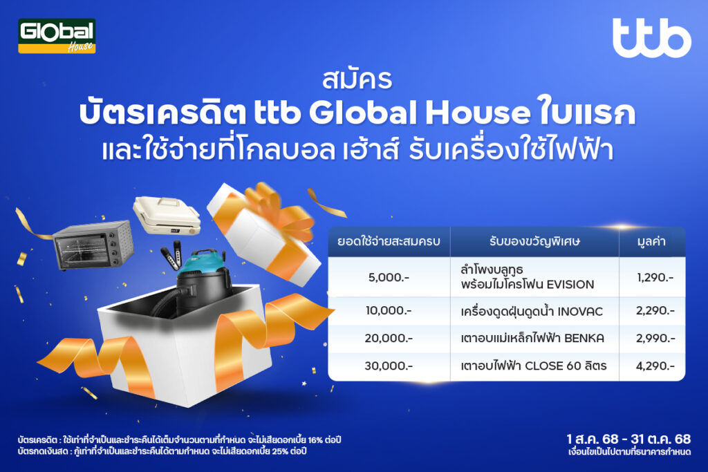 กรุงเทพฯ, 18 สิงหาคม 2568 — ทีเอ็มบีธนชาต หรือ ทีทีบี มอบของขวัญยิ่งใหญ่ สุดปัง ในโอกาสฉลองครบรอบ 2 ปี ttb Global House เพื่อแทนคำขอบคุณที่ลูกค้าเลือกใช้บัตรเครดิตและบัตรกดเงินสด ttb Global House เป็นพาร์ตเนอร์คู่ใจในทุกการใช้จ่ายเกี่ยวกับบ้าน ไม่ว่าจะเป็นการตกแต่ง ต่อเติม ซ่อมแซม หรือสร้างชีวิตความเป็นอยู่ที่ดีขึ้นในทุกวัน ด้วยโปรโมชันความคุ้มค่าดีที่สุดที่เคยมีมา ที่ทีทีบีมอบให้กับลูกค้าที่ช้อปสินค้าที่โกลบอล เฮ้าส์ ทุกสาขา อาทิ คูปองส่วนลดสำหรับการซื้อสินค้าโกลบอล เฮ้าส์ ลำโพงไร้สาย EVISION พร้อมไมโครโฟน เครื่องดูดฝุ่นดูดน้ำ INOVAC เตาแม่เหล็กไฟฟ้า BENKA เตาอบไฟฟ้า CLOSE เมื่อมียอดใช้จ่ายสะสมตามเงื่อนไขที่ธนาคารกำหนด หรือ รับฟรี กระเป๋าเดินทาง BSC Luxury 20 นิ้ว ตั้งแต่วันที่ 1 สิงหาคม – 31 ตุลาคม 2568