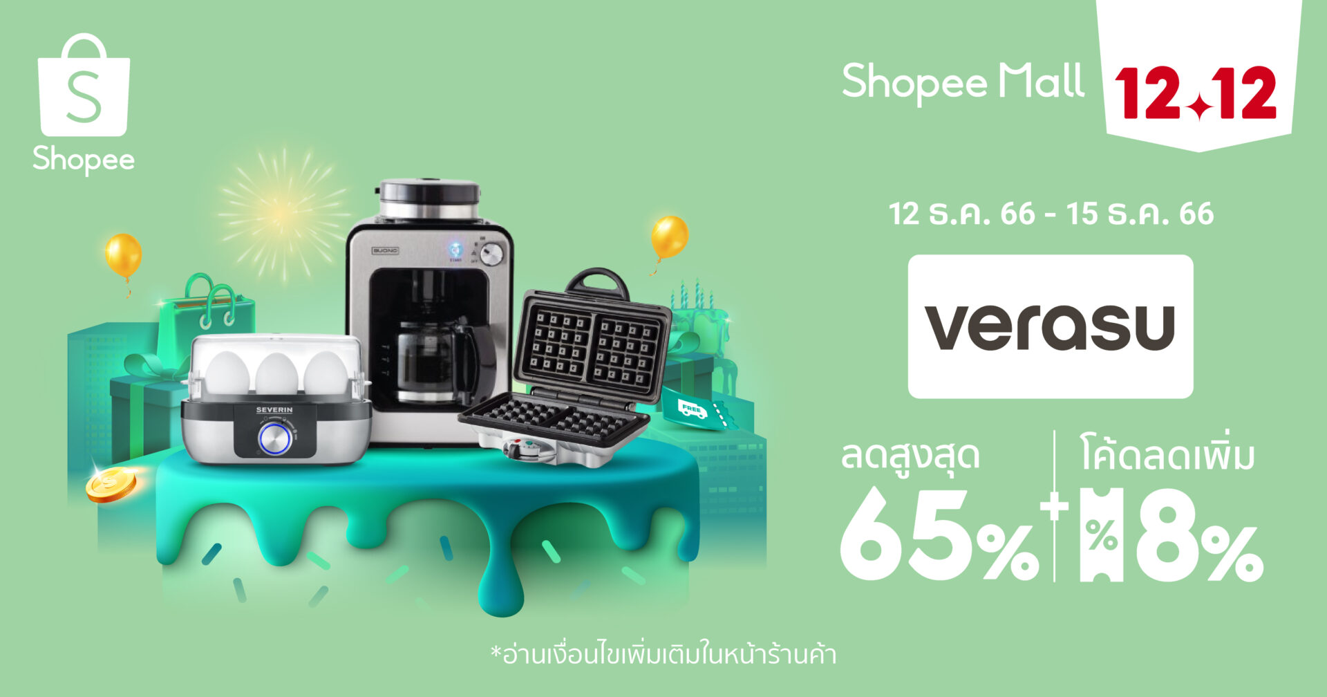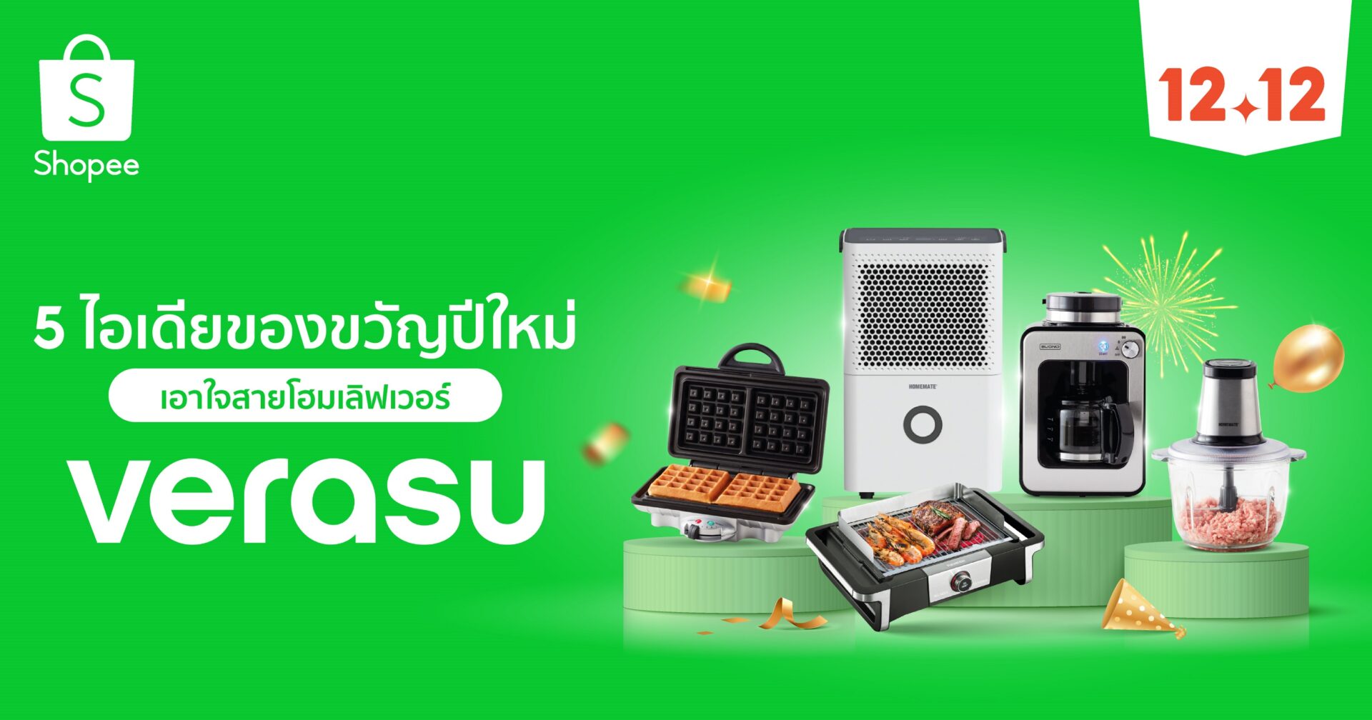 เทศกาลส่งท้ายปี ถือเป็นช่วงเวลาสุดพิเศษที่ทุกคนต่างอยากส่งมอบความสุขให้กับคนที่ คุณรัก วีรสุ (Verasu) แบรนด์เครื่องใช้ไฟฟ้าและอุปกรณ์ในครัวที่มีอายุกว่า 45 ปี จึงขอแชร์ไอเดียของขวัญปีใหม่ ที่รับรองว่าสุขใจคนให้ ถูกใจคนรับ อย่างแน่นอน นอกจากนี้ เพื่อส่งต่อความสุขอย่างต่อเนื่อง วีรสุ ร่วมกับ ช้อปปี้ ผู้นำแพลตฟอร์มอีคอมเมิร์ซในภูมิภาคเอเชียตะวันออกเฉียงใต้และไต้หวัน มอบโปรโมชั่นสุดยิ่งใหญ่ ครอบคลุมสินค้าเครื่องใช้ไฟฟ้าภายในบ้านกว่า 500 รายการ ฉลองมหกรรมช้อปออนไลน์สุดยิ่งใหญ่ส่งท้ายปีอย่าง Shopee 12.12 ลดใหญ่วันเกิด ตั้งแต่วันที่ 7 – 15 ธันวาคม 2566