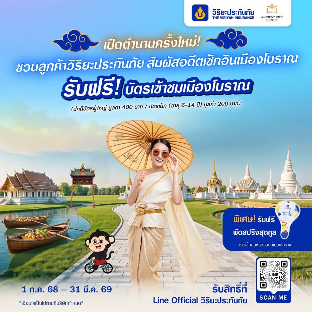 วิริยะประกันภัย เดินหน้าขยายเครือข่ายพันธมิตร “Viriyah Privileges” อย่างต่อเนื่อง เผยแคมเปญล่าสุด รุกเอาใจลูกค้าสายท่องเที่ยว มอบสิทธิพิเศษ “Viriyah Privileges ทริปเที่ยวเมืองโบราณ สู่ประสบการณ์สุดประทับใจ” เอกสิทธิ์เฉพาะสำหรับลูกค้า วิริยะประกันภัย เพียงลงทะเบียนเพื่อรับสิทธิ์ผ่าน LINE Official วิริยะประกันภัย รับสิทธิ์เข้าชมเมืองโบราณฟรี 1 สิทธิ์ ต่อ 1 กรมธรรม์ ต่อวัน พร้อมส่วนลดพิเศษ 50% สำหรับผู้ติดตามสูงสุด 5 ท่าน ตั้งแต่วันนี้ ถึง 31 มีนาคม 2569