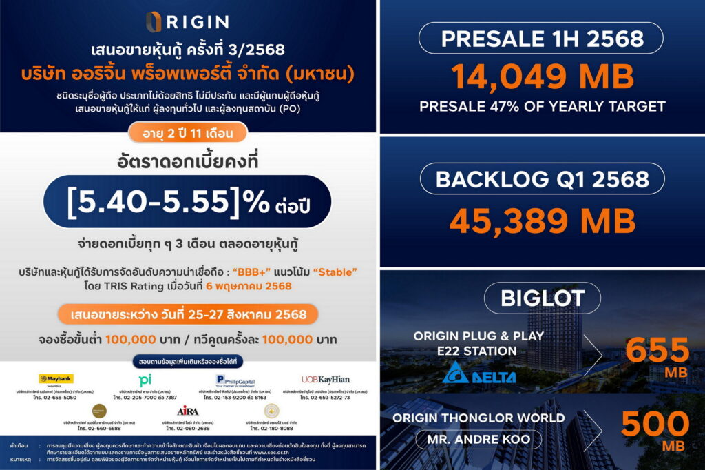 ออริจิ้น พร็อพเพอร์ตี้ ยื่นไฟลิ่งเตรียมเสนอขายหุ้นกู้ครั้งที่ 3/2568 ชุดใหม่จ่ายดอกเบี้ยทุก 3 เดือน ตลอดอายุหุ้นกู้ อัตราดอกเบี้ย [5.40-5.55]% ต่อปี เตรียมเปิดจองวันที่ 25-27 สิงหาคม 2568 ผ่านสถาบันการเงินทั้ง 7 แห่ง