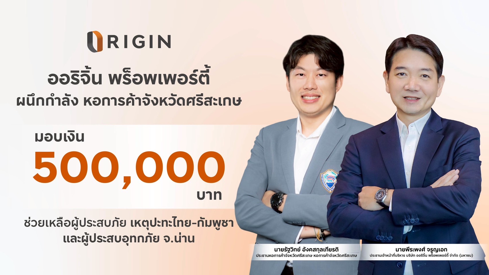 “ออริจิ้น พร็อพเพอร์ตี้ ได้ตระหนักถึงความทุกข์ยากของประชาชน ที่ได้รับผลกระทบทั้งด้านร่างกาย และจิตใจ เราพร้อมส่งกำลังใจ และช่วยเหลือประชาชน ที่ได้รับผลกระทบหลังจากสถานการณ์ความไม่สงบบริเวณชายแดนไทย – กัมพูชา ให้กลับมามีชีวิต และความเป็นอยู่ กลับคืนสู่สภาวะปกติโดยเร็ว พร้อมส่งต่อความห่วงใยไปยังผู้ประสบอุทกภัยน้ำท่วม ในจังหวัดน่าน
