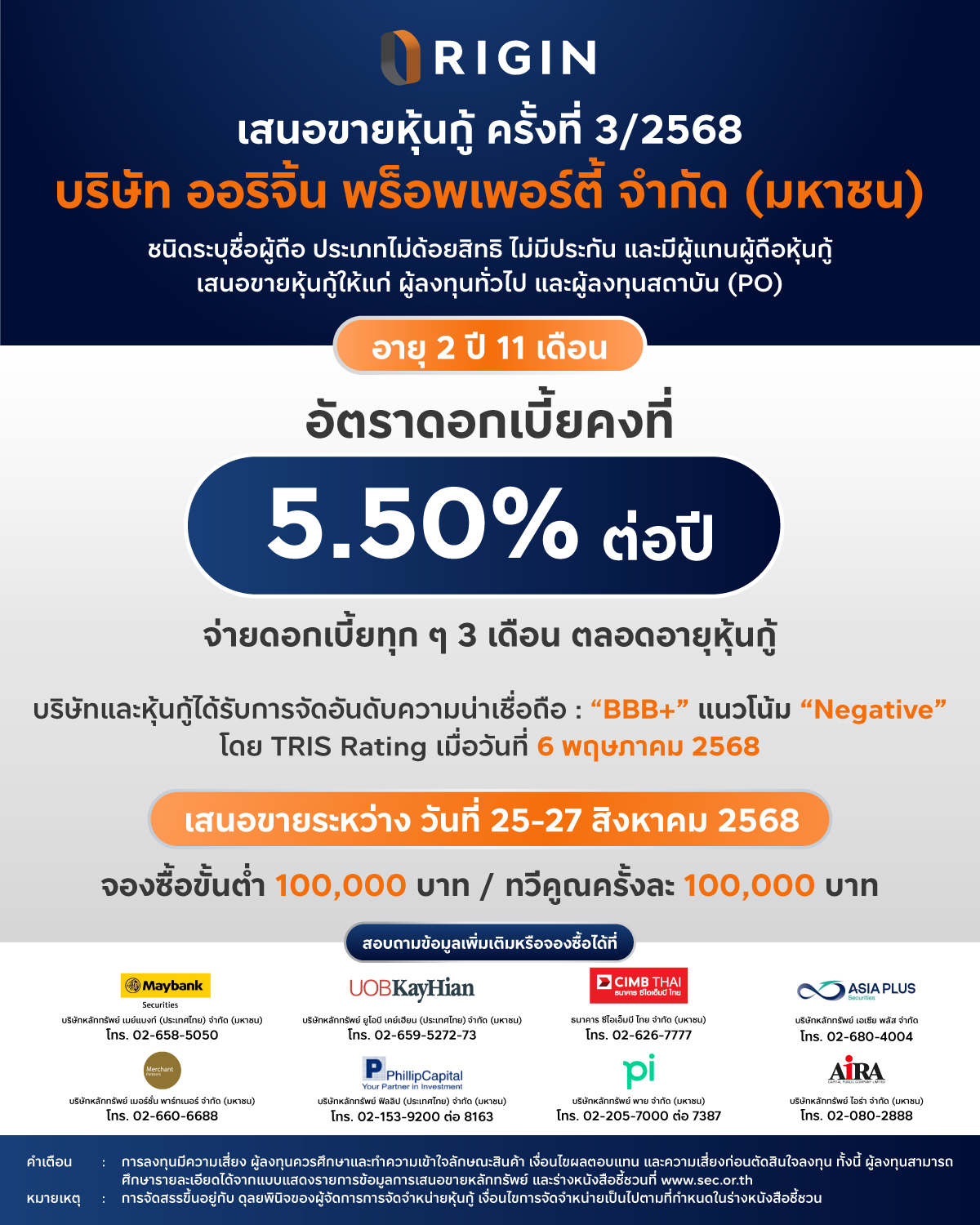 ก.ล.ต.ไฟเขียว ออริจิ้น พร็อพเพอร์ตี้ เสนอขายหุ้นกู้ครั้งที่ 3/2568 ชุดใหม่ จ่ายดอกเบี้ยทุกๆ 3 เดือน ตลอดอายุหุ้นกู้ 5.50% ต่อปี เสนอขาย 25-27 สิงหาคม 2568 นี้ ผ่าน 8 โบรกเกอร์ดัง เสริมสร้างความยืดหยุ่นโครงสร้างทางการเงิน รักษาสภาพคล่องควบคู่รับรู้รายได้จากโครงการพร้อมโอน