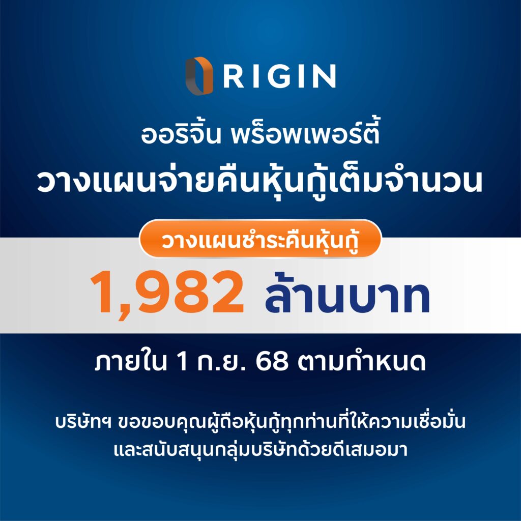 ออริจิ้น พร็อพเพอร์ตี้ โชว์สภาพคล่องทางการเงินแข็งแกร่ง หนุนธุรกิจเดินหน้าเติบโต วางแผนชำระคืนหุ้นกู้ 2 ชุดจำนวน 1,982 ล้านบาท ที่จะครบกำหนดในวันที่ 1 กันยายน 2568 โดยบริษัทฯมีความพร้อมในการชำระคืนเต็มจำนวนตามกำหนด