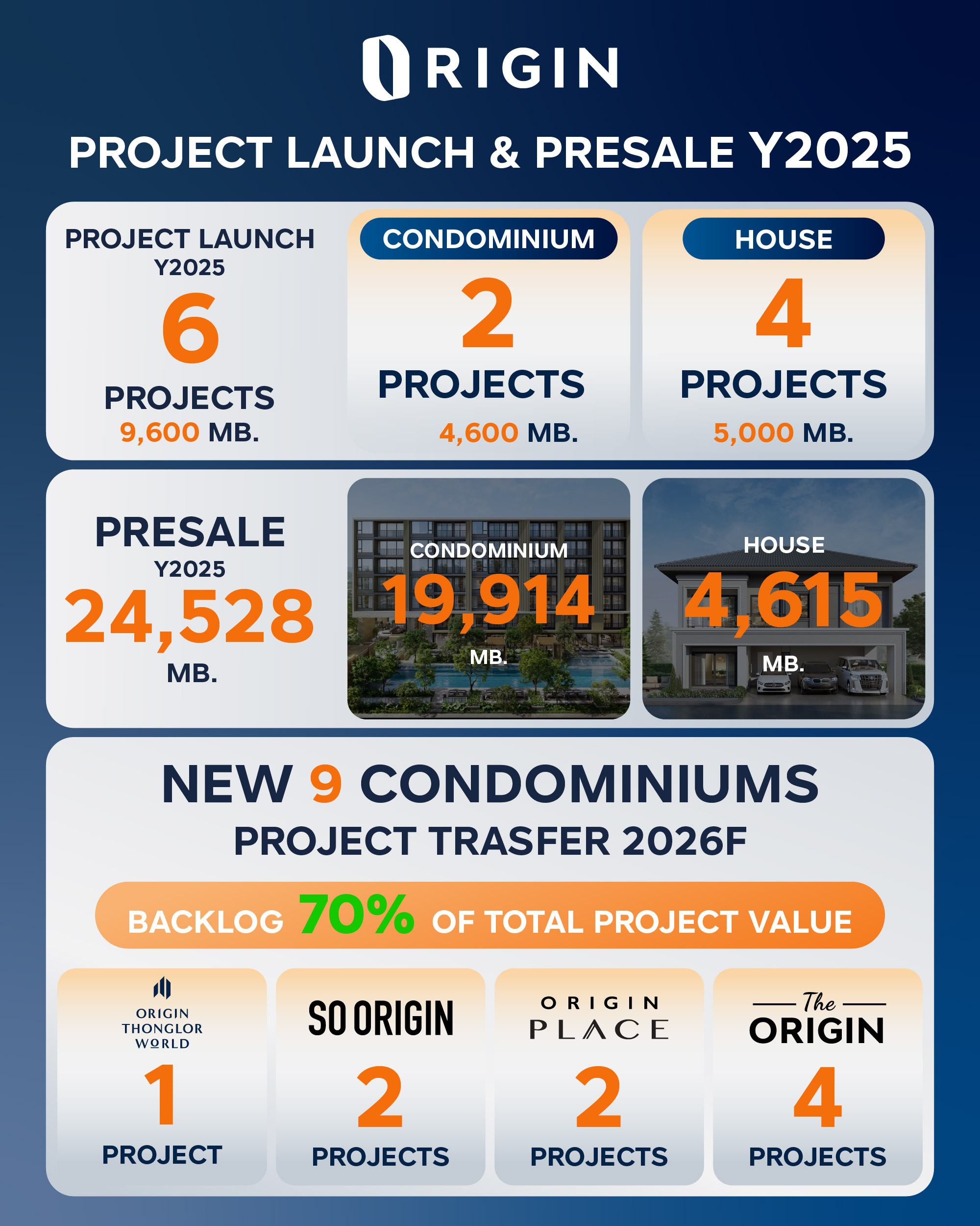 ปี 2568 ถือเป็นปีที่ภาพรวมตลาดอสังหาฯอยู่ในสภาวะกดดันและเผชิญความท้าทายหลายด้าน ทั้งจากกำลังซื้อของผู้บริโภค ความเข้มงวดในการปล่อยสินเชื่อของสถาบันการเงินที่นำไปสู่ Reject Rate สูงขึ้น ภาวะหนี้ครัวเรือนสูง และปัจจัยทางเศรษฐกิจทั้งภายในและภายนอกประเทศที่ส่งผลต่อความมั่นใจในการตัดสินใจซื้อของผู้บริโภค ออริจิ้น มีการปรับตัวและมีโครงการสร้างธุรกิจที่หลากหลายทั้ง อสังหาริมทรัพย์เพื่อขาย และกลุ่มธุรกิจ Recurring Income ที่สร้างรายได้ประจำสม่ำเสมอ รวมทั้งระมัดระวังในการดำเนินธุรกิจ การเปิดตัวโครงการใหม่นั้น จึงมีความยืดหยุ่นตามความเหมาะสม ตามกลยุทธ์ Resilience Leads To Sustainable Growth สร้างความยืดหยุ่นในการบริหารองค์กรพร้อมรับมือต่อการเปลี่ยนแปลง สู่การเป็นผู้นำและการเติบโตอย่างยั่งยืนบนโอกาสใหม่ เพื่อสร้างความสมดุลในระยะยาวอย่างมีเสถียรภาพทั้งด้านธุรกิจ สังคม และสิ่งแวดล้อม ที่จะสร้างความยั่งยืนให้กับบริษัทฯ ในระยะยาว โดยในปี 2568 มีโครงการเปิดใหม่รวม 6 โครงการ มูลค่ารวม 9,600 ล้านบาท แบ่งเป็นที่อยู่อาศัยแนวราบ 4 โครงการ มูลค่ารวม 5,000 ล้านบาท และ เป็น คอนโดมิเนียม 2 โครงการ มูลค่า 4,600 ล้านบาท