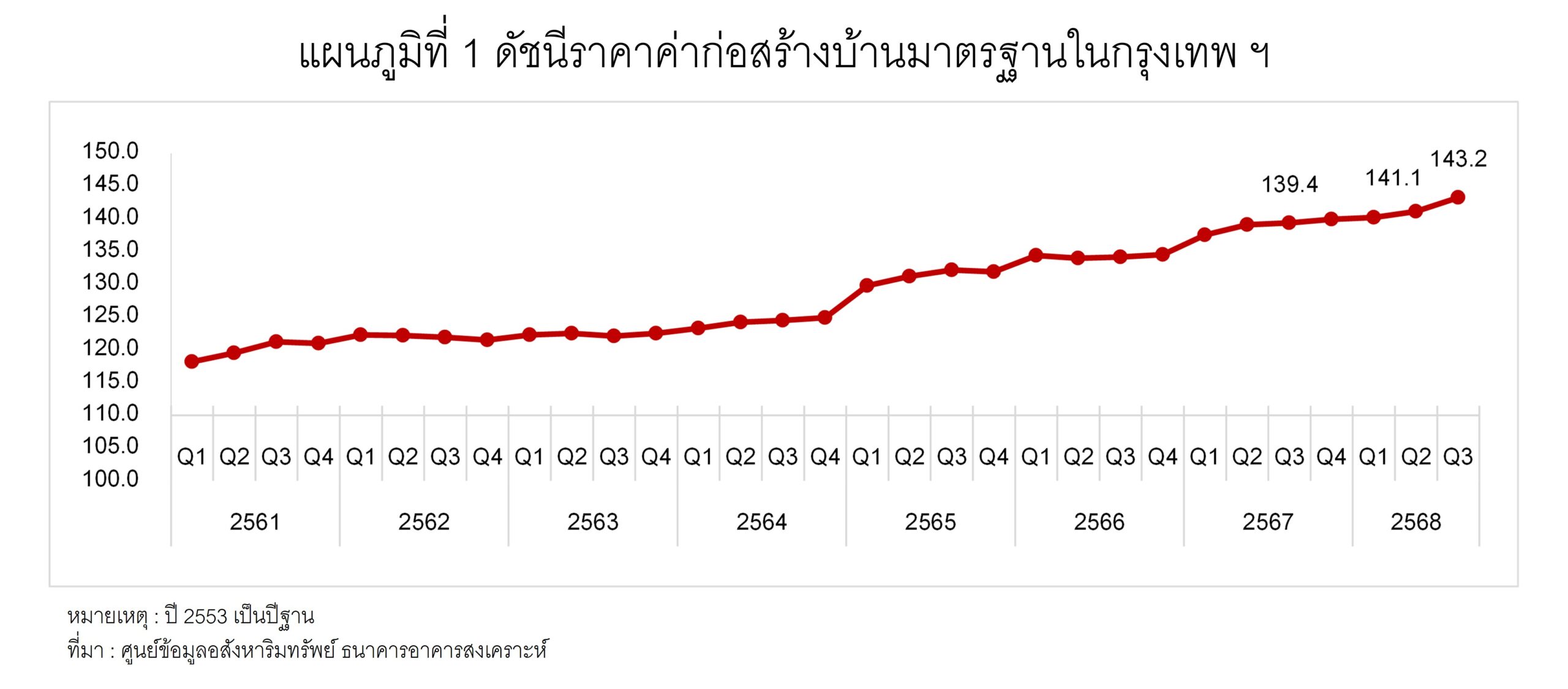 ราคาค่าก่อสร้างบ้านมาตรฐาน ไตรมาส 3 ปี 2568” พบว่า มีค่าดัชนีเท่ากับ 143.2 เพิ่มขึ้นร้อยละ 1.5 เมื่อเทียบกับ
