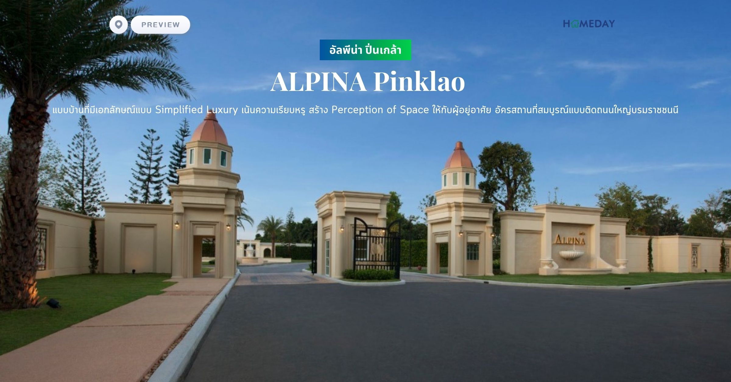 "โครงการ อัลพีน่า ปิ่นเกล้า (ALPINA Pinklao) จากรูปแบบบ้านที่มีเอกลักษณ์แบบ Simplified Luxury เน้นความเรียบหรูจากรายละเอียดและวัสดุตกแต่ง รวมถึงรูปแบบของการจัดวางสวนที่เปิดกว้างต่อมุมมองเพื่อสร้าง Perception of Space ให้กับผู้อยู่อาศัย อัครสถานที่สมบูรณ์แบบติดถนนใหญ่บรมราชชนนี"