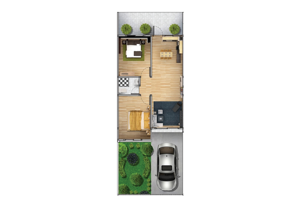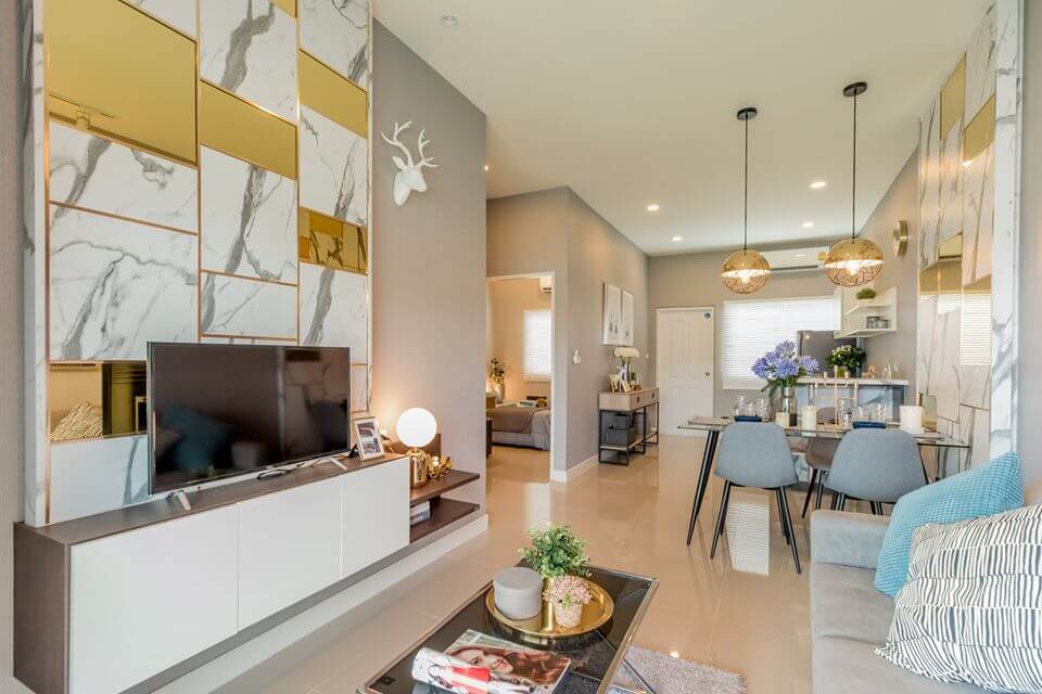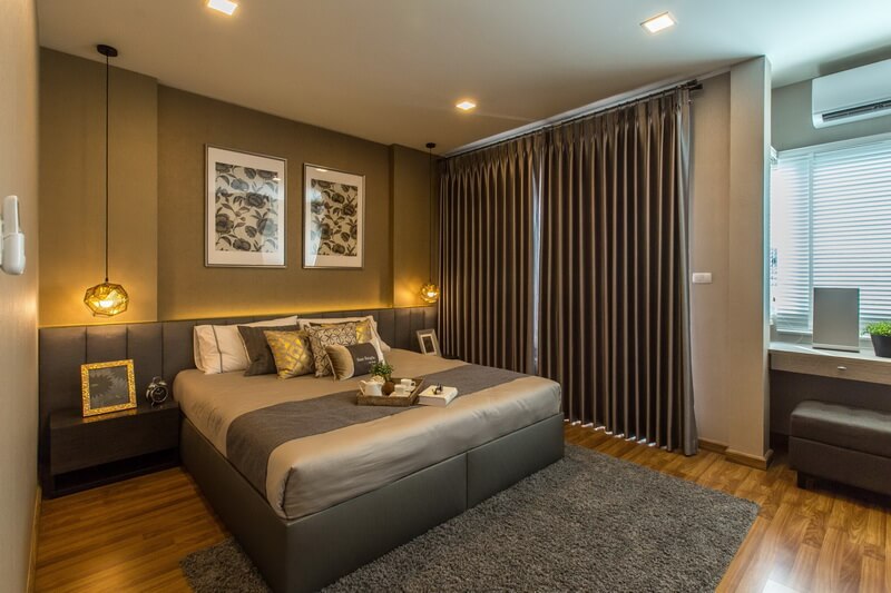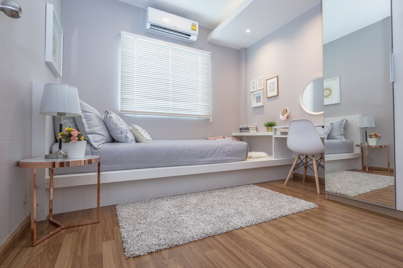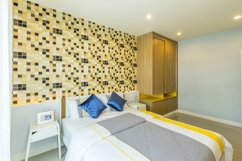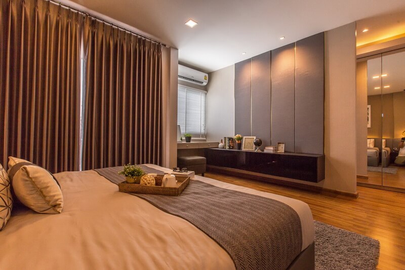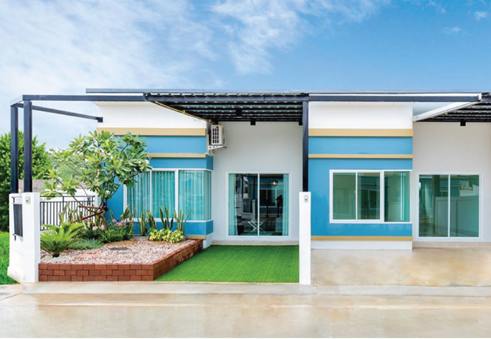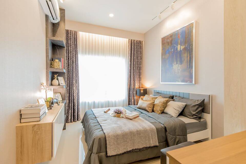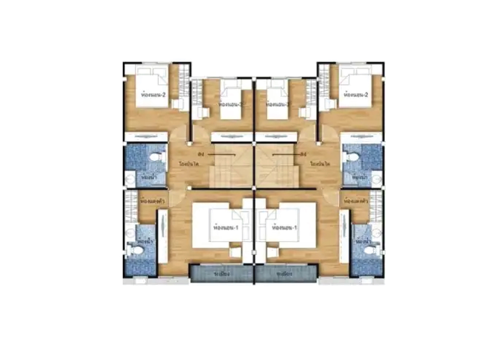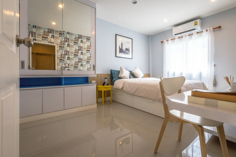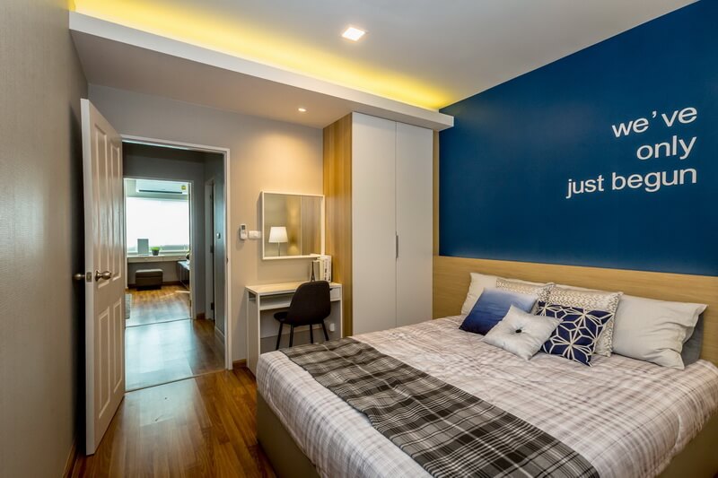 พาไปชมในส่วนของห้องนอนกันต่อ เริ่มต้นที่ห้องแรกซ้ายมือติดบันไดจะเป็น Bedroom 2 ครับ ห้องนี้บ้านตัวอย่างออกแบบตกแต่งมาเป็นห้องนอนของลูกชายในโทนสีฟ้า ภา
