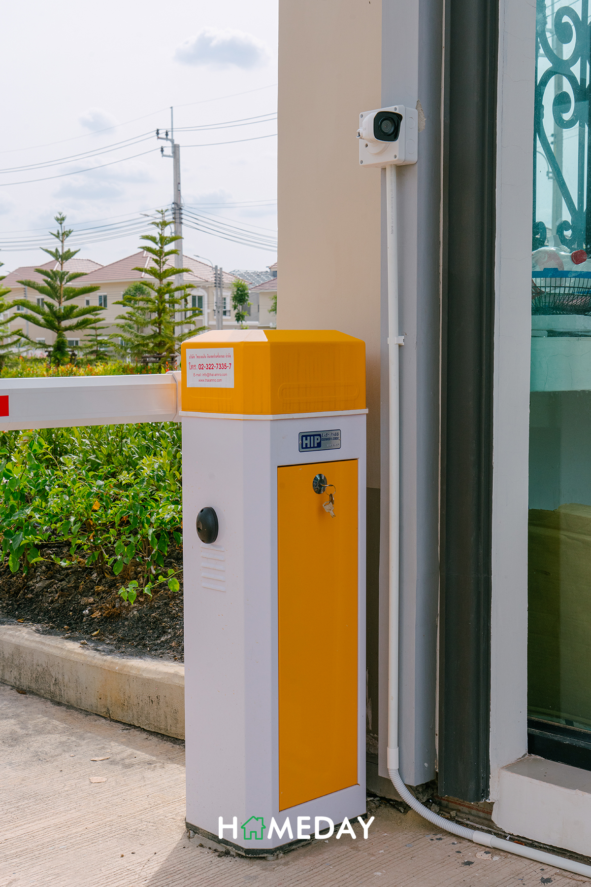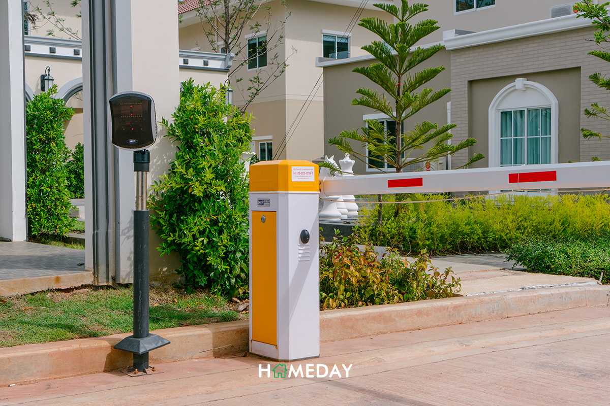 ซุ้มประตูทางเข้าโครงการตกแต่งมาในสไตล์ French Coronial แยกส่วนเข้า-ออกเป็น 2 ฝั่ง กั้นด้วยไม้กระดกตามมาตรฐานค่ะ ตัวไม้กระดกแต่ละฝั่งก็จะแยกออกเป็น 2 ด้าน ด้านซ้ายจะเป็นเลนส์ของลูกบ้านค่ะ ส่วนทางขวาติดกับป้อมจะเป็นทางเข้าของแขก ต้องแลกบัตรกับทางรปภ. ทุกครั้งก่อนเข้าค่ะ