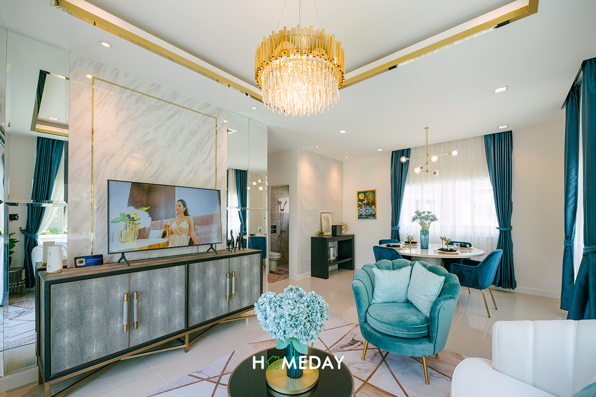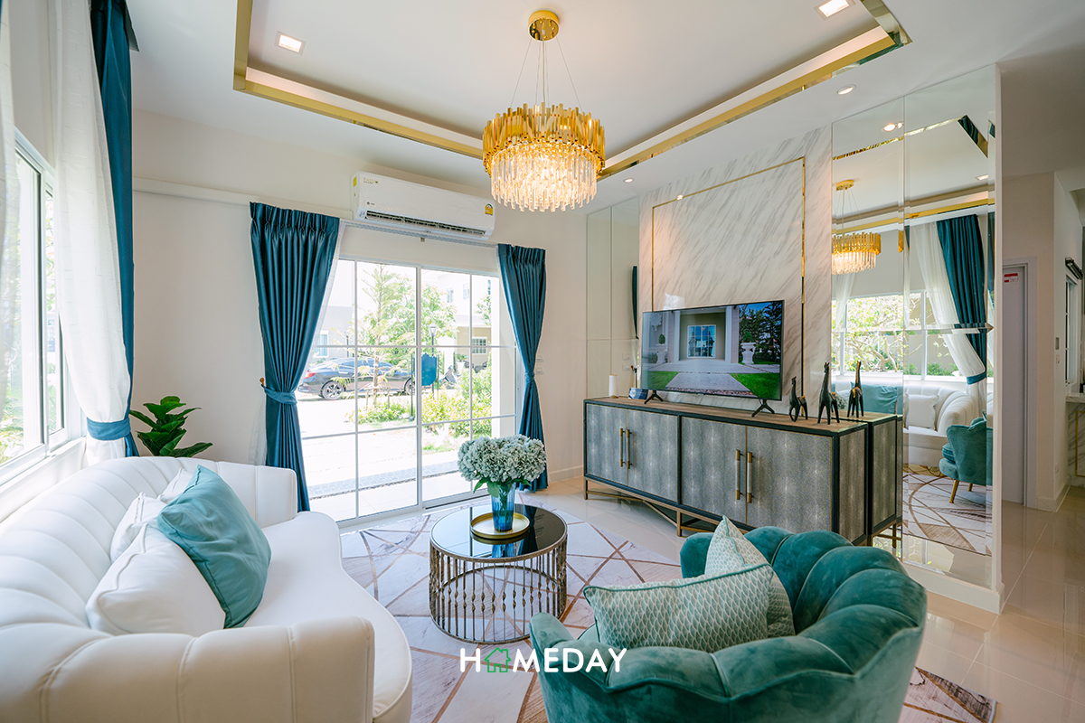 Living Area ได้พื้นที่ค่อนข้างใกล้เคียงกับแบบบ้านก่อนหน้าเลยค่ะ สามารถวางโซฟาขนาด 3-4 ที่นั่งได้สบาย ๆ มีพื้นที่เหลือเพียงพอสำหรับวางโต๊ะกลางขนาดใหญ่ ชั้นวางทีวีก็ได้ระยะห่างตามมาตรฐานของการรับชม เหลือพื้นที่รอบบริเวณให้สามารถเดินผ่านไปมาได้อย่างสะดวกสบายค่ะ