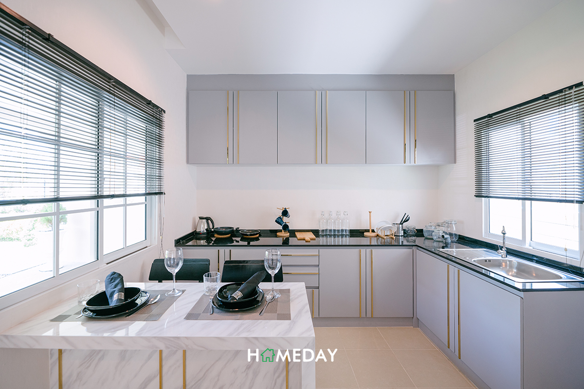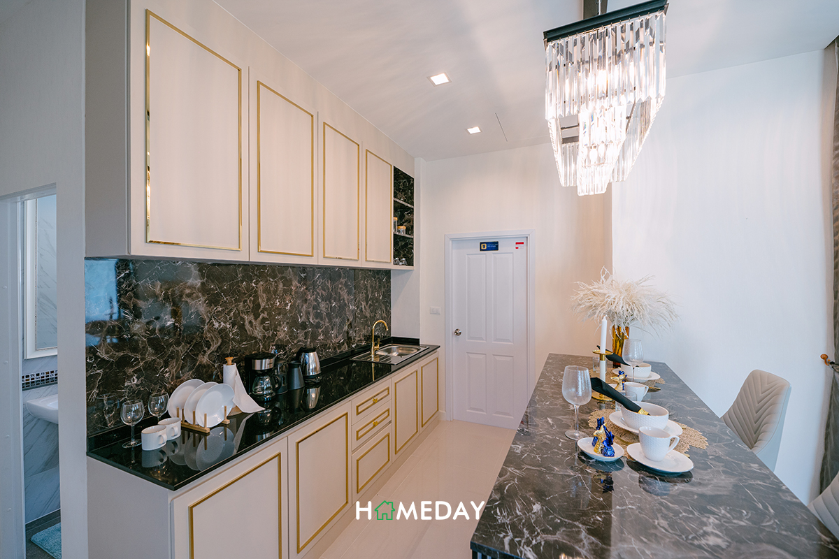 ติดกันจะเป็นพื้นที่โล่ง ๆ มีบานประตูเชื่อมออกไปยังลานซักล้างค่ะ บ้านตัวอย่างบิลต์ตกแต่งให้ดูเป็นชุดเคาน์เตอร์ครัวและไอซ์แลนด์สำหรับเตรียมอาหารในสไตล์ครัวฝรั่ง ที่ไม่ได้เน้นการทำอาหารที่จริงจังมากนักค่ะ หากบิลต์ยาวเต็มพื้นที่ ก็สามารถใช้จัดเก็บอุปกรณ์ครัว ภาชนะต่าง ๆ รวมไปถึงสามารถวางซิงค์ล้างจานและเตาไฟฟ้าได้แบบลงตัวเลย