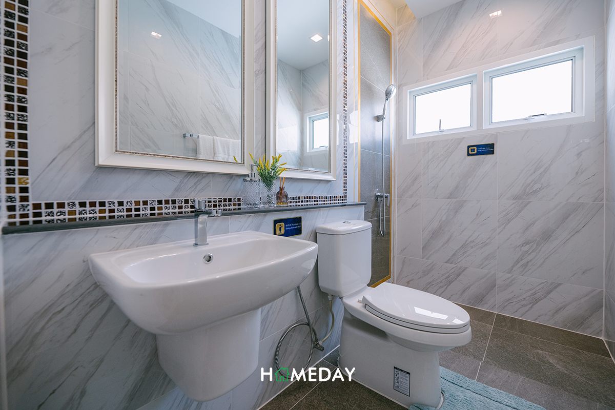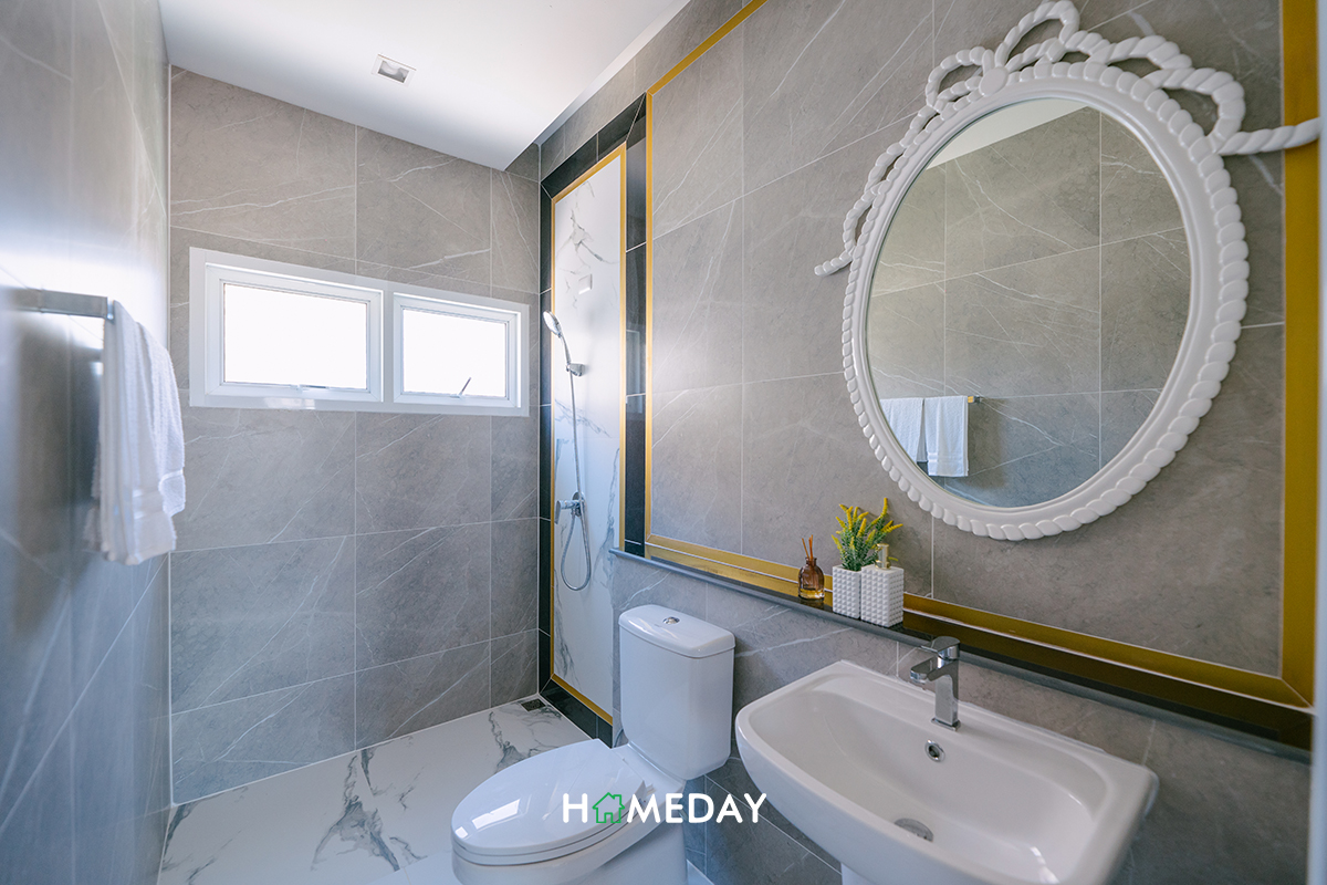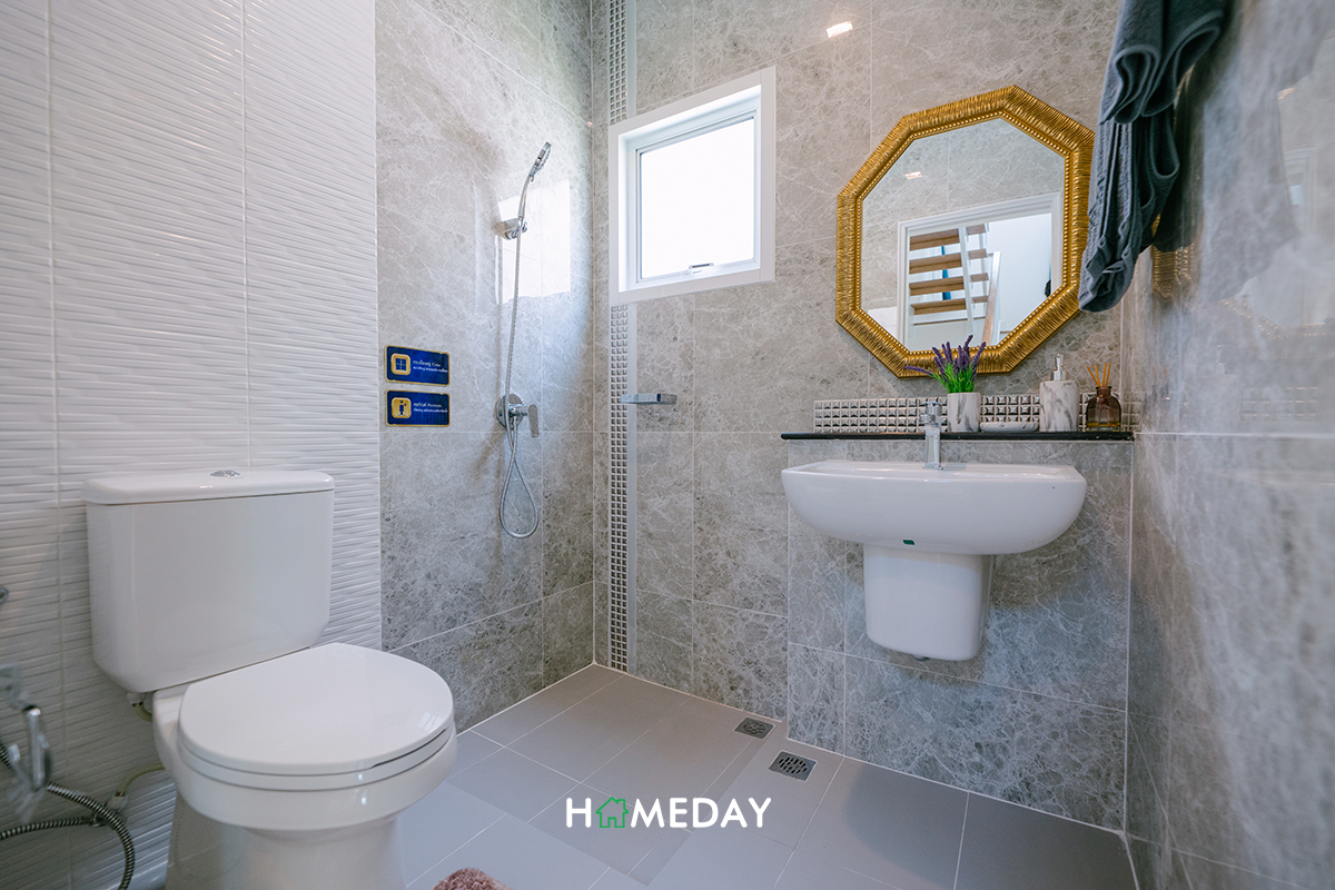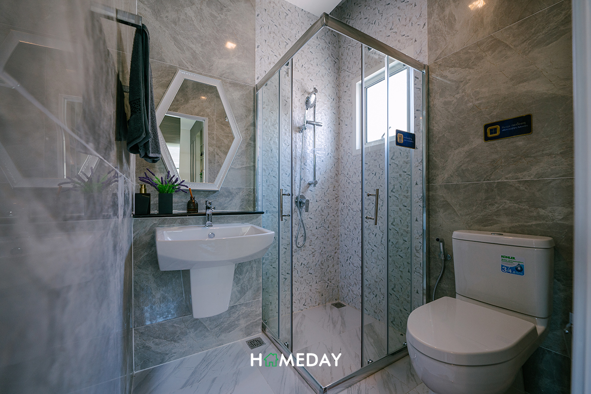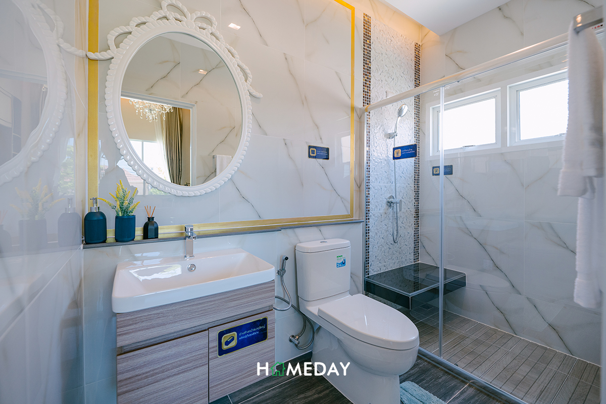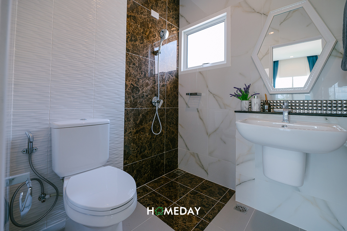 ตัวห้องน้ำภายในได้ฟังก์ชันการใช้งานมาเหมือนกับห้องน้ำชั้นล่างทุกประการเลยค่ะ แนะนำให้กั้นในส่วนของ Partition เพิ่มเช่นเดียวกันนะคะ เพราะจะได้ดูแลทำความสะอาดห้องน้ำได้ง่ายขึ้นค่ะ