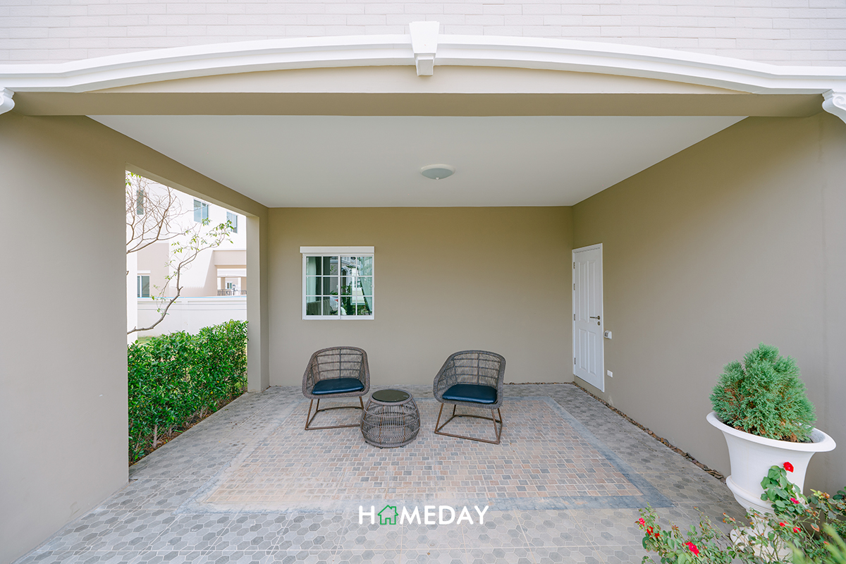 มาเริ่มต้นกันด้วยแบบบ้าน IMPERIAL ซึ่งถือเป็นแบบบ้านเดี่ยวที่ใหญ่ที่สุดของโครงการกันก่อนเลยค่ะ ตัว Facade ของบ้านออกแบบมาในสไตล์ French Coronial โดดเด่นด้วยคิ้วบัวปูนสีขาวแบบโรมัน ตัวบ้านภายนอกเลือกใช้สีเบจ ช่วยทำให้ภาพรวมดูหรูหราทีเดียวค่ะ ด้านหน้าได้พื้นที่จอดรถ 2 คัน พร้อมประตูทางเข้ารอง ส่วนทางเข้าหลักได้พื้นที่ด้านหน้าประตูยกระดับในร่ม กันแดดกันฝนมาให้ สามารถวางตู้เก็บรองเท้าและที่วางร่มได้เลยค่ะ