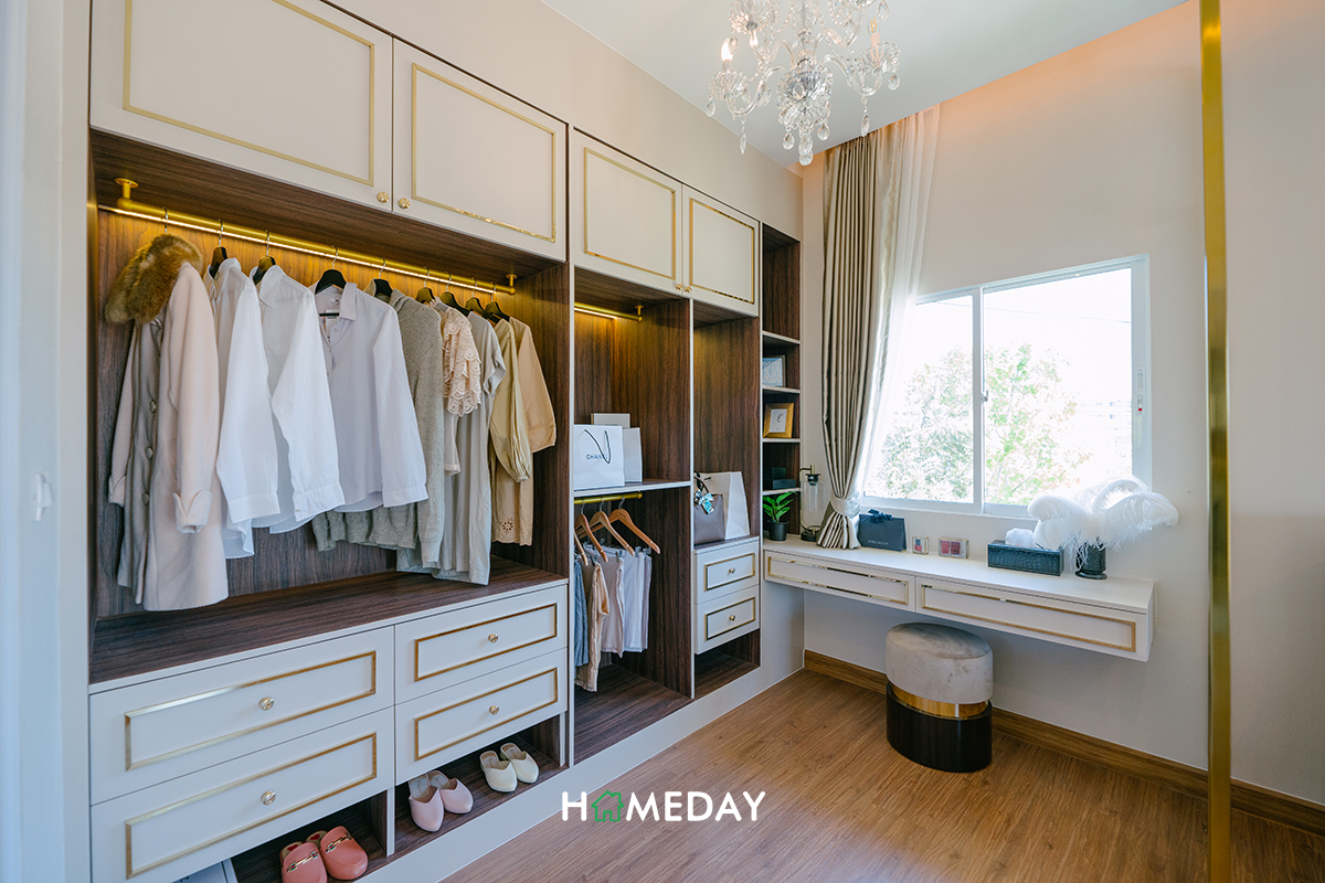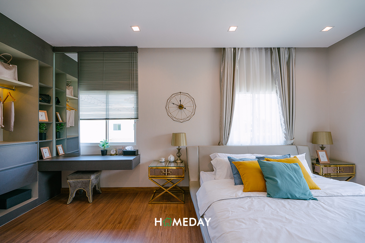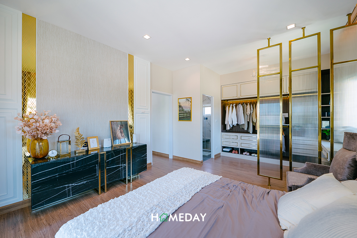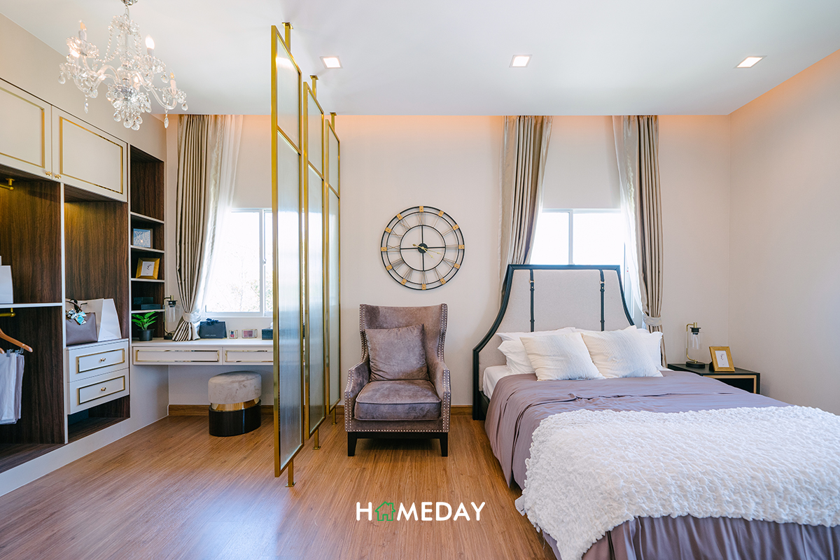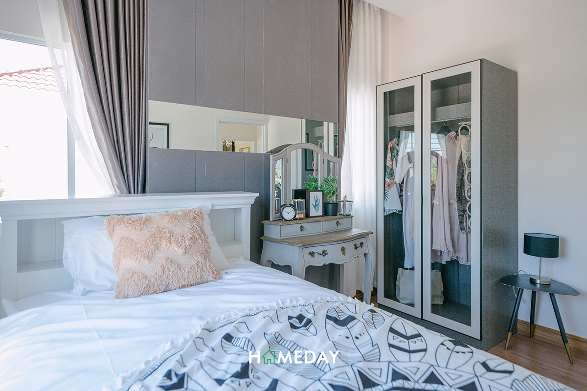 ส่วนทางฝั่งซ้ายมือของห้อง ทางโครงการวาง Walk-in Closet ขนาดใหญ่พร้อมโต๊ะเครื่องแป้งเอาไว้ให้ดูเป็นแนวทางค่ะ รับรองว่าสามารถจัดเก็บเสื้อผ้าและเครื่องประดับต่าง ๆ เพียงพอสำหรับ 2 ท่านได้อย่างแน่นอนค่ะ ถ้าอยากให้ห้องมีความเป็นสัดส่วนเพิ่มมากขึ้น แนะนำให้ติดตั้ง Partition กั้นระหว่างส่วนเตียงและ Walk-in Closet เพิ่มนะคะ