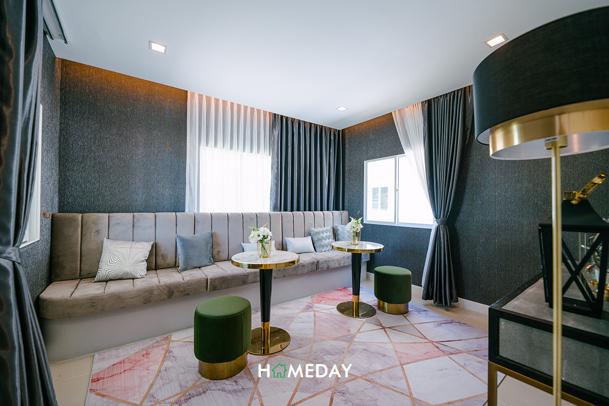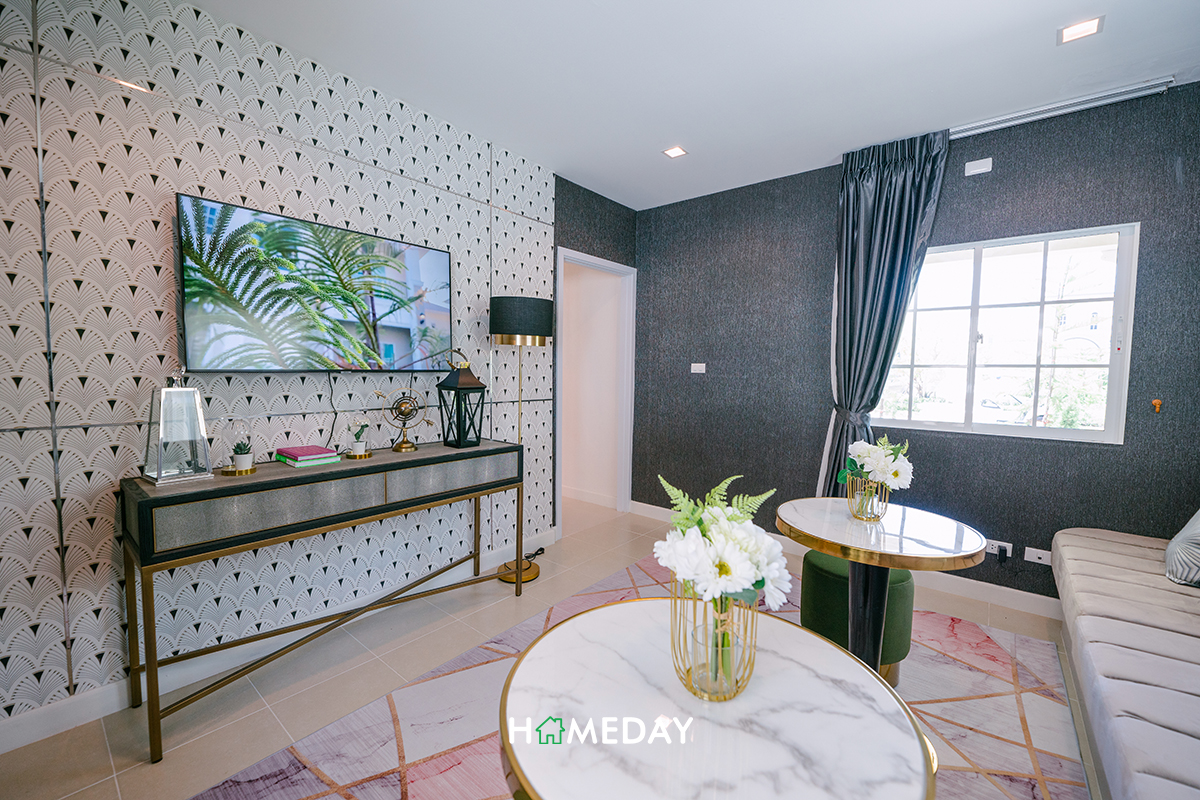 ติดกับห้องน้ำ จะเป็นพื้นที่ของ Bedroom 4 ค่ะ แม้จะเป็นห้องนอนชั้นล่าง แต่ก็ได้พื้นที่มาแบบจัดเต็มทีเดียวค่ะ วางเตียงได้ถึง 5 ฟุตสบาย ๆ เลย ภายในได้บานหน้าต่างมารอบทิศ รับแสงเข้าสู่ตัวห้องได้เป็นอย่างดีเลยค่ะ สามารถวางทั้งเตียงและเฟอร์นิเจอร์พื้นฐานได้ครบถ้วนแน่นอน ส่วนทางด้านของบ้านตัวอย่างก็ตกแต่งให้ดูเป็น Entertainment room ที่สมาชิกในครอบครัวสามารถเข้ามาใช้เวลาร่วมกันได้ค่ะ แต่ถ้าใครมีไอเดียอื่น ๆ ก็สามารถรังสรรค์พื้นที่ให้ออกมาตามความต้องการของเราได้เลย