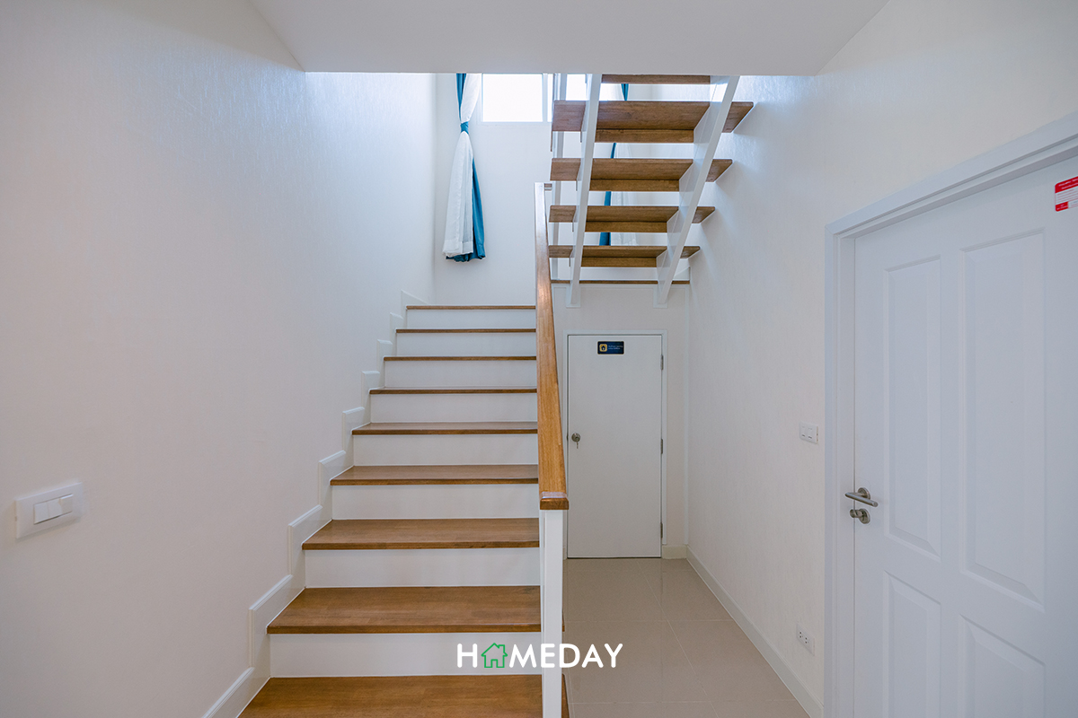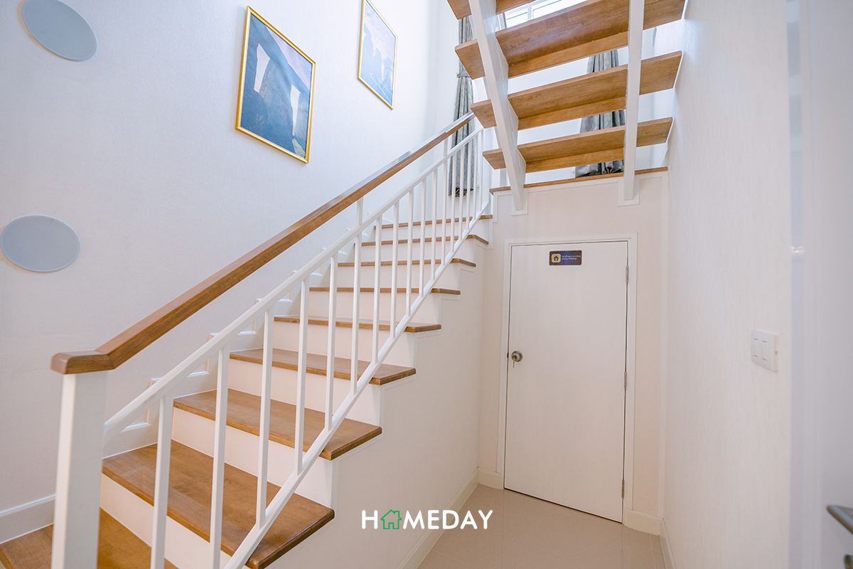 ก่อนจะเดินขึ้นไปสำรวจที่ชั้น 2 กัน ขอแนะนำพื้นที่บริเวณใต้บันไดกันสักเล็กน้อยค่ะ ตรงนี้จะมีส่วนของบานประตูห้องเก็บของอยู่นะคะ ภายในได้พื้นที่ทั้งหมดด้านใต้บันไดเลย เก็บของได้หลากหลายแน่นอนค่ะ ไม่ต้องกลัวว่าพวกอุปกรณ์ทำความสะอาดหรือกระเป๋าเดินทางที่ไม่ค่อยได้ใช้จะอยู่รบกวนสายตา