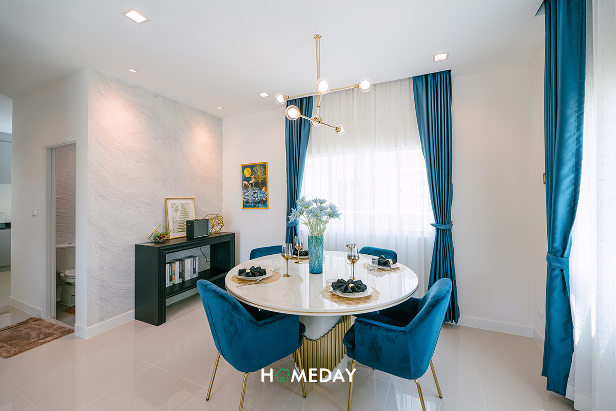 Dining Area ติดกัน ได้พื้นที่มาค่อนข้างกว้างเลยค่ะ สามารถวางชุดโต๊ะรับประทานอาหารขนาด 4-6 ที่นั่งได้เลย ด้านข้างยังเหลือพื้นที่สำหรับวางเคาน์เตอร์และชั้นเก็บของเพิ่มเติมได้ด้วยค่ะ สามารถใช้พื้นที่บริเวณนี้ได้อย่างคุ้มค่าแน่นอน