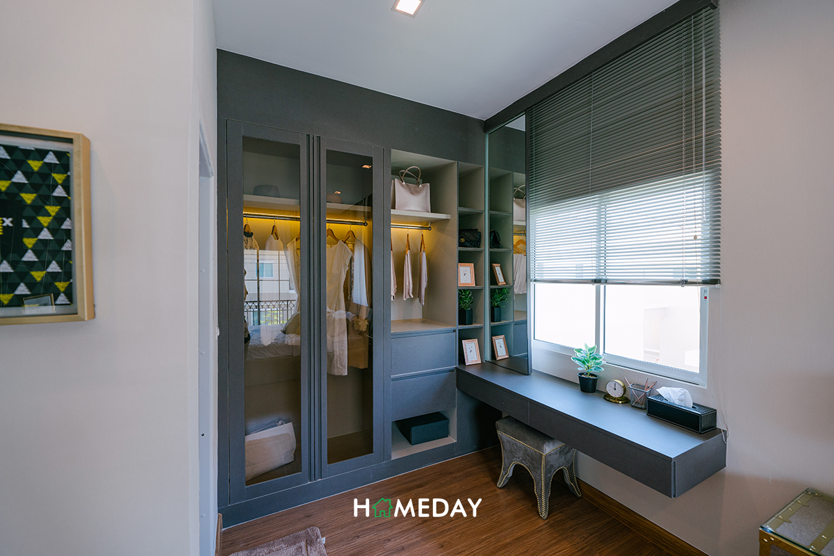 ซ้ายมือของห้อง ทางโครงการบิลต์ Walk-in Closet พร้อมโต๊ะอเนกประสงค์เอาไว้ให้ดูเป็นแนวทางค่ะ บอกเลยว่ามีพื้นที่เหลือเพียงพอสำหรับการจัดเก็บเสื้อผ้าอย่างแน่นอน ตัวโต๊ะจะเลือกวางเป็นโต๊ะทำงาน หรือโต๊ะเครื่องแป้งก็ลงตัว เพราะอยู่ติดบานหน้าต่าง ช่วยรับแสงสำหรับการแต่งหน้าและอ่านหนังสือได้เลยค่ะ