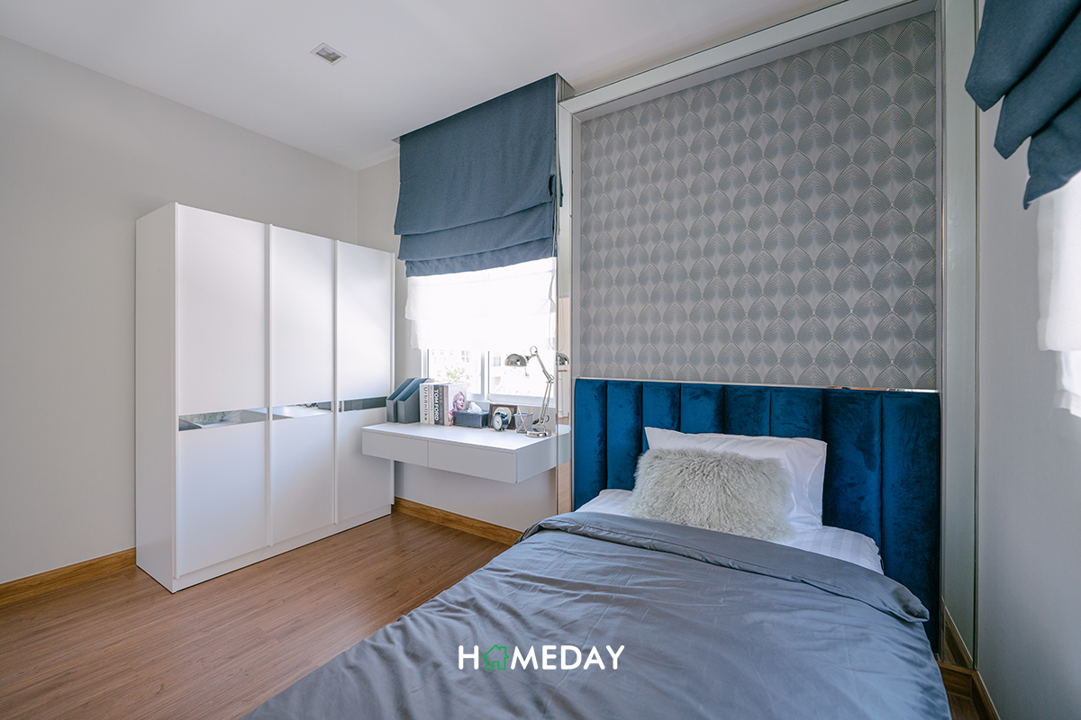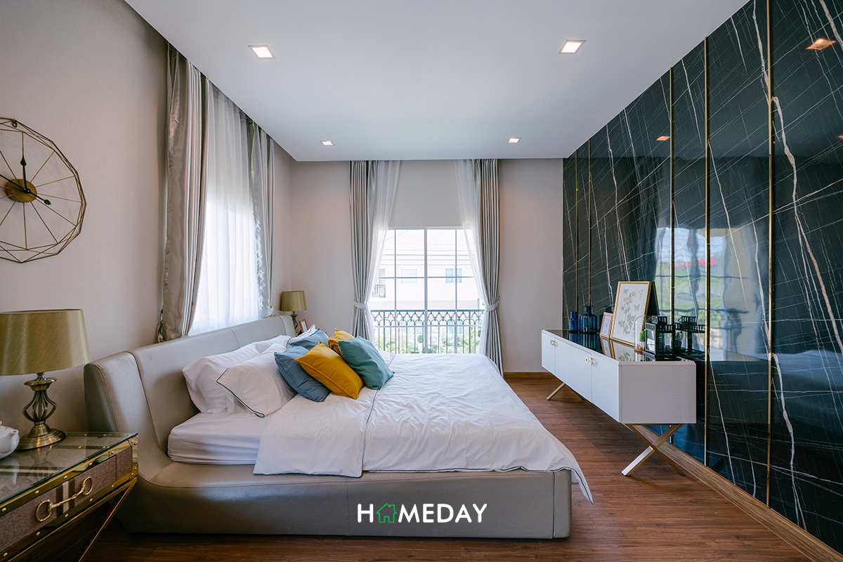 พื้นที่วางเตียงรองรับเตียงขนาด 6 ฟุต โดยที่ยังเหลือพื้นที่โดยรอบสำหรับวางโต๊ะหัวเตียงได้ทั้ง 2 ฝั่งเลยค่ะ ส่วนปลายเตียงก็สามารถวางชั้นทีวีหรือชั้นเก็บของได้เลย มีพื้นที่เหลือสำหรับการเดินเข้า-ออกได้ไม่สะดุดค่ะ
