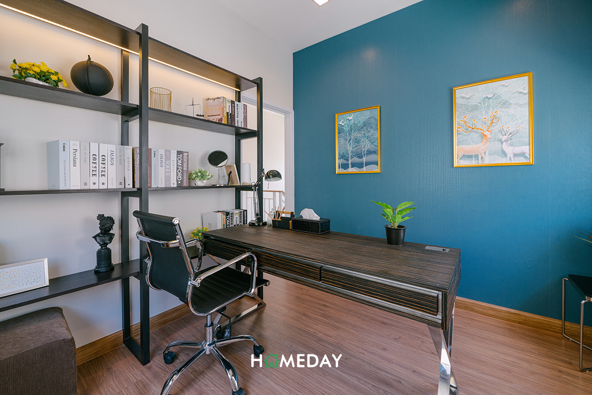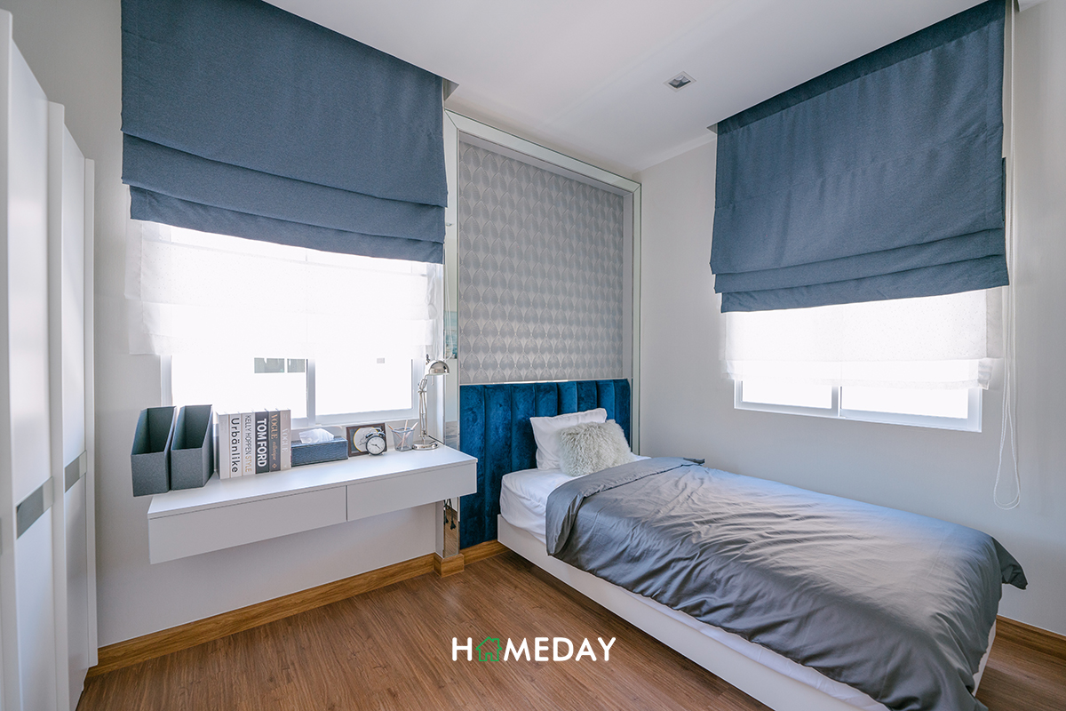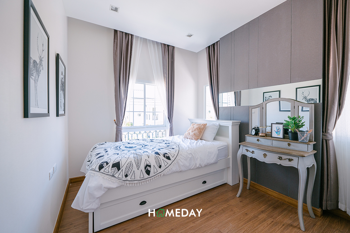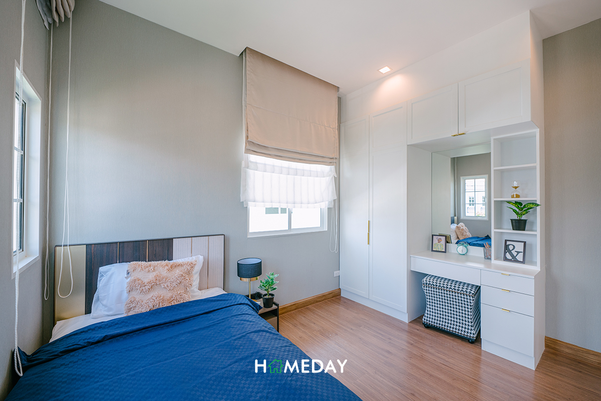 ปิดท้ายกันด้วย Bedroom 3 ค่ะ บ้านตัวอย่างตกแต่งให้เราดูเป็นลักษณะของห้องทำงานส่วนตัว ซึ่งก็ถือเป็นไอเดียที่ดีเลยค่ะ สำหรับคนที่มี Small Business หรือต้องการพื้นที่ในการทำงาน Work From Home แต่ถ้าหากจะปรับเป็นห้องนอน ก็สามารถวางเตียงขนาด 3.5 ฟุต พร้อมเฟอร์นิเจอร์พื้นฐานได้ครบครันค่ะ