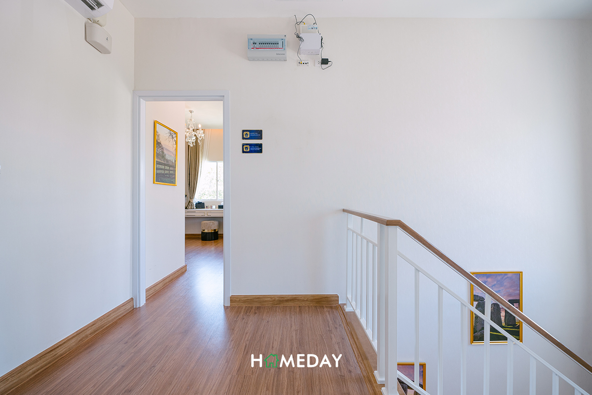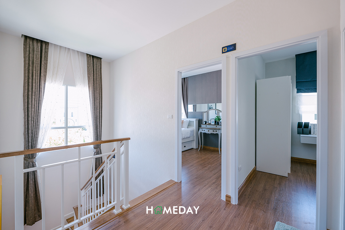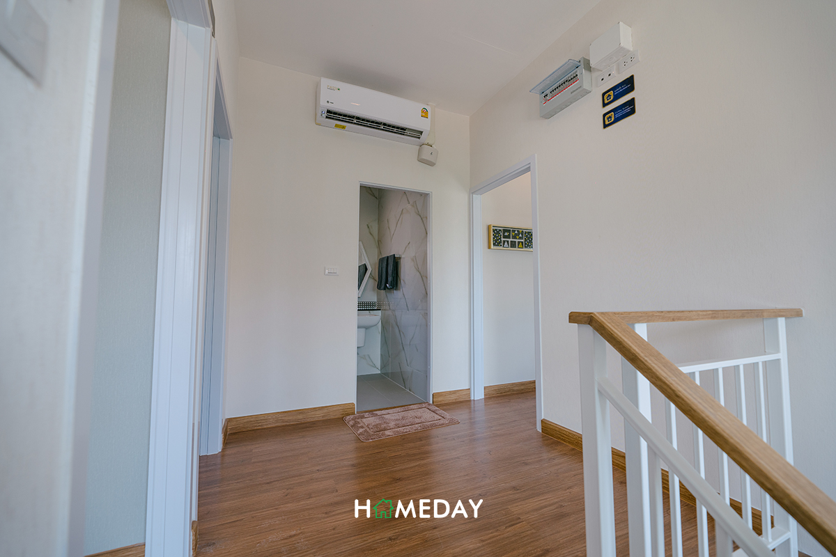 เดินขึ้นมาดูกันที่ชั้น 2 ต่อเลยค่ะ โถงของชั้น 2 เหลือพื้นที่บริเวณผนังให้สามารถแขวนชั้นวางของเพิ่มเติมได้ค่ะ ตรงข้ามบันไดเป็นห้องน้ำค่ะ ทางขวาเป็นทางเข้า Master Bedroom ส่วนด้านซ้ายเป็นห้อง Bedroom 2 และ Bedroom 3 อยู่ติดกันค่ะ