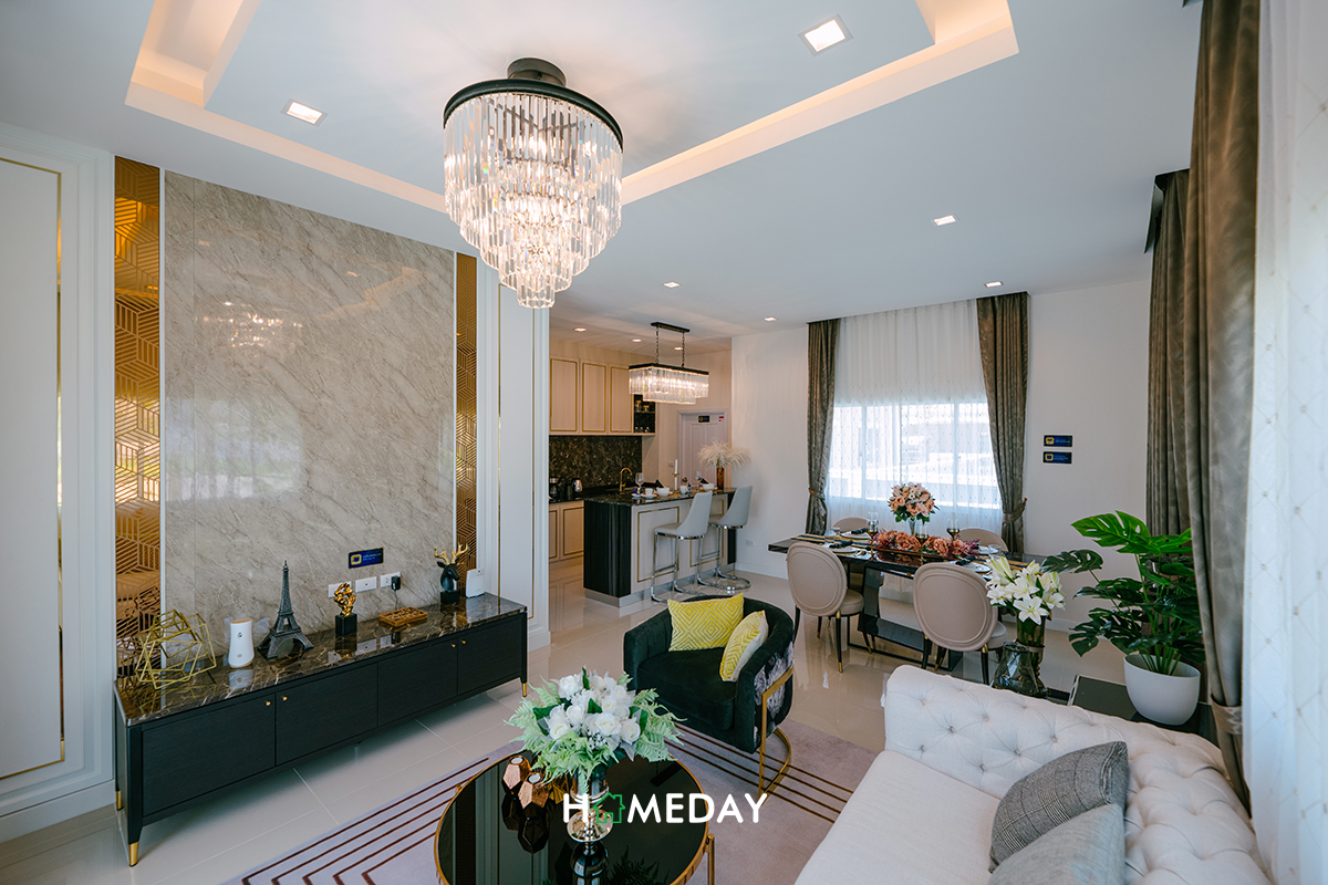 ภายในตัวบ้าน เมื่อเปิดเข้ามาก็จะเจอกับ Living Area ที่อยู่เชื่อมกับ Dining Area ด้านในสุดค่ะ ระหว่าง 2 พื้นที่นี้จะมีโถงทางเดินที่เชื่อมไปยังห้องน้ำและห้องครัวของตัวบ้านค่ะ