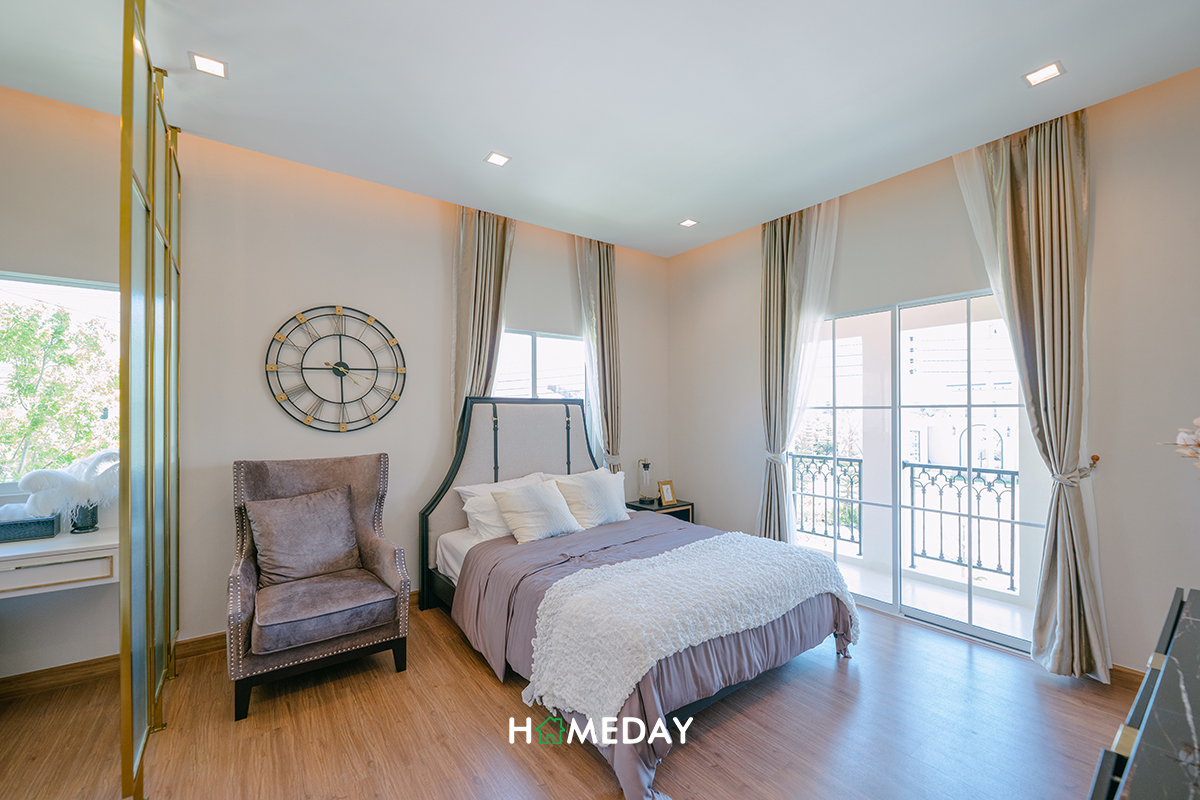 ด้านใน Master Bedroom ได้แปลนห้องเป็นแบบหน้ากว้างเช่นเดียวกันกับแบบบ้านแรกค่ะ ขวามือของห้องเป็นพื้นที่สำหรับวางเตียง อยู่ติดกับระเบียงห้อง ตัวระเบียงสามารถใช้งานได้จริงนะคะ มีท่อระบายน้ำไว้ให้ด้วย หมดปัญหาเรื่องฝนตกน้ำขังไปได้เลย ส่วนด้านซ้ายจะเป็นมุมสำหรับวาง Walk-in Closet เชื่อมห้องน้ำในตัวของห้อง บานหน้าต่างรับแสงได้มา 2 บานค่ะ รวมบานประตูกระจกเชื่อมระเบียงก็จะได้ช่องแสงรวมกัน 3 จุด ส่องสว่างทั่วถึงทั้งห้องได้แน่นอน