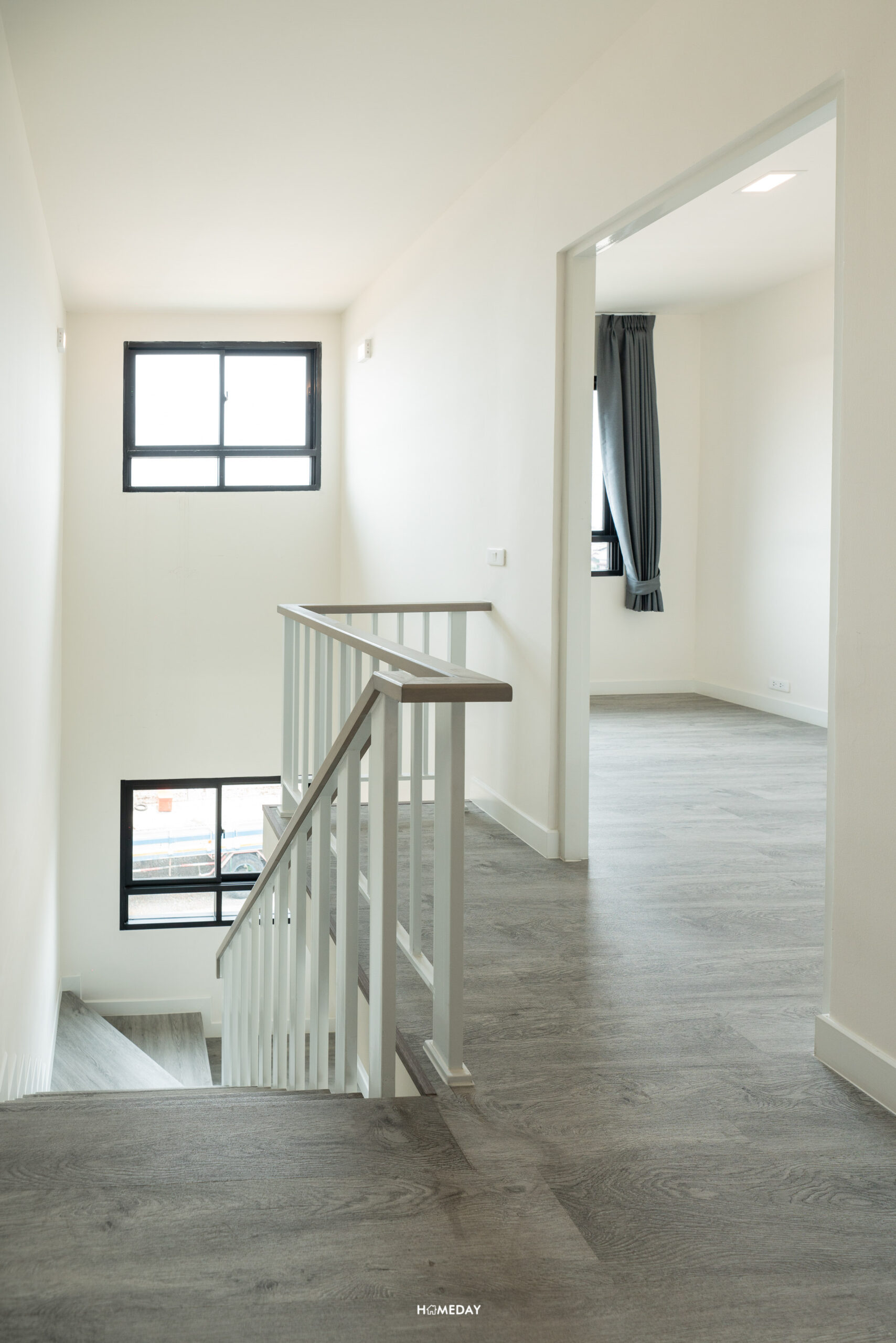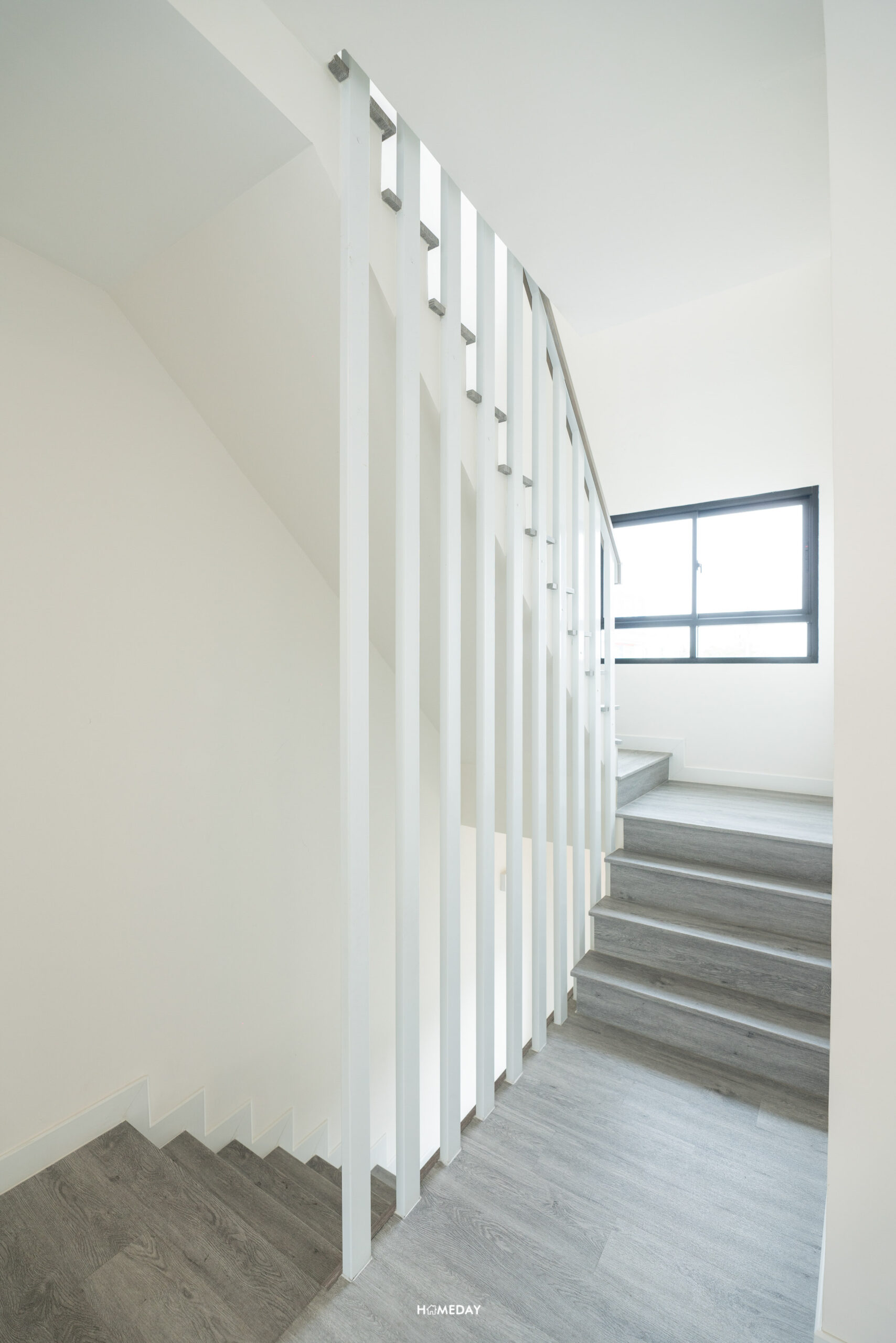 ขึ้นไปชั้น 2 กันครับ โครงสร้างบันไดเป็นคอนกรีตเสริมเหล็ก มีหน้าต่างเพิ่มช่องแสง ราวบันไดเป็นราวเหล็กทาสีขาว มือจับทำจากไม้สีเดียวกันกับพื้น เข้าชุดกันสวยงามครับ ราวจับของบันไดชั้น 2 จะเปลี่ยนมาเป็นลักษณะแบบระแนง ให้แสงได้ลอดผ่าน ทำให้ชานพักบันไดดูไม่อึดอัด ไม่คับแคบ ส่วนระยะความกว้างของบันได้ก็ได้มาตรฐาน เดินสวนกันได้สบาย ๆ ครับ