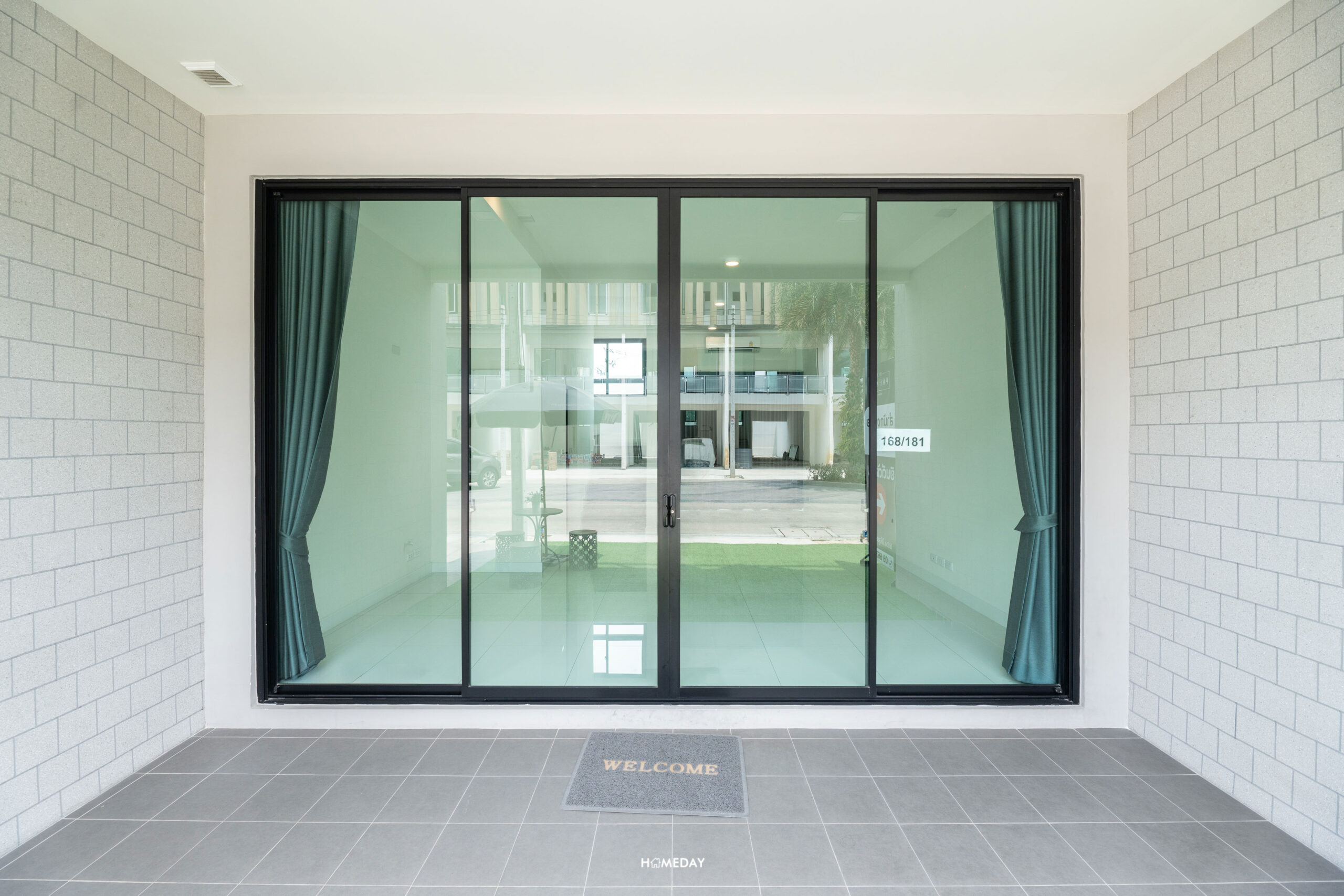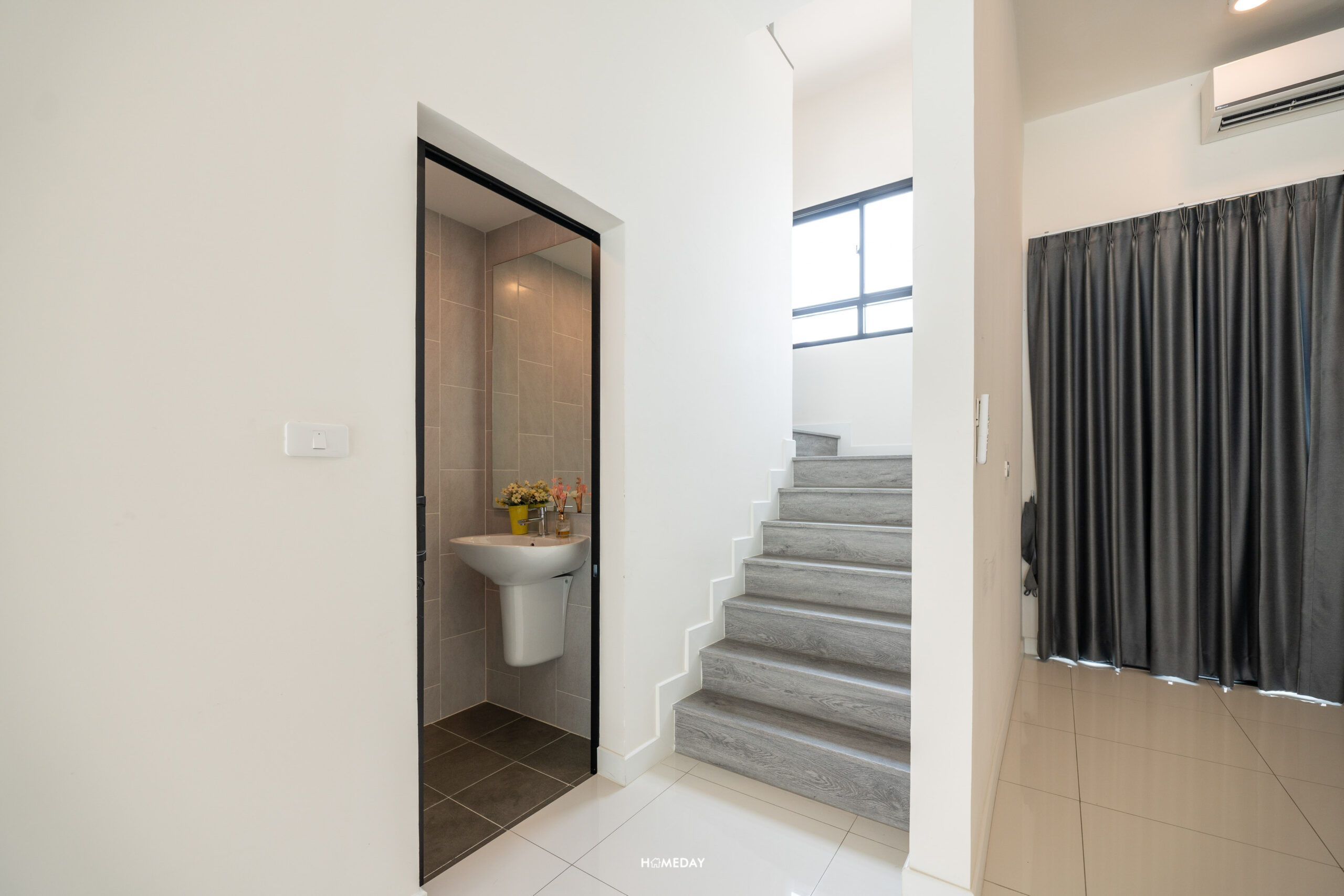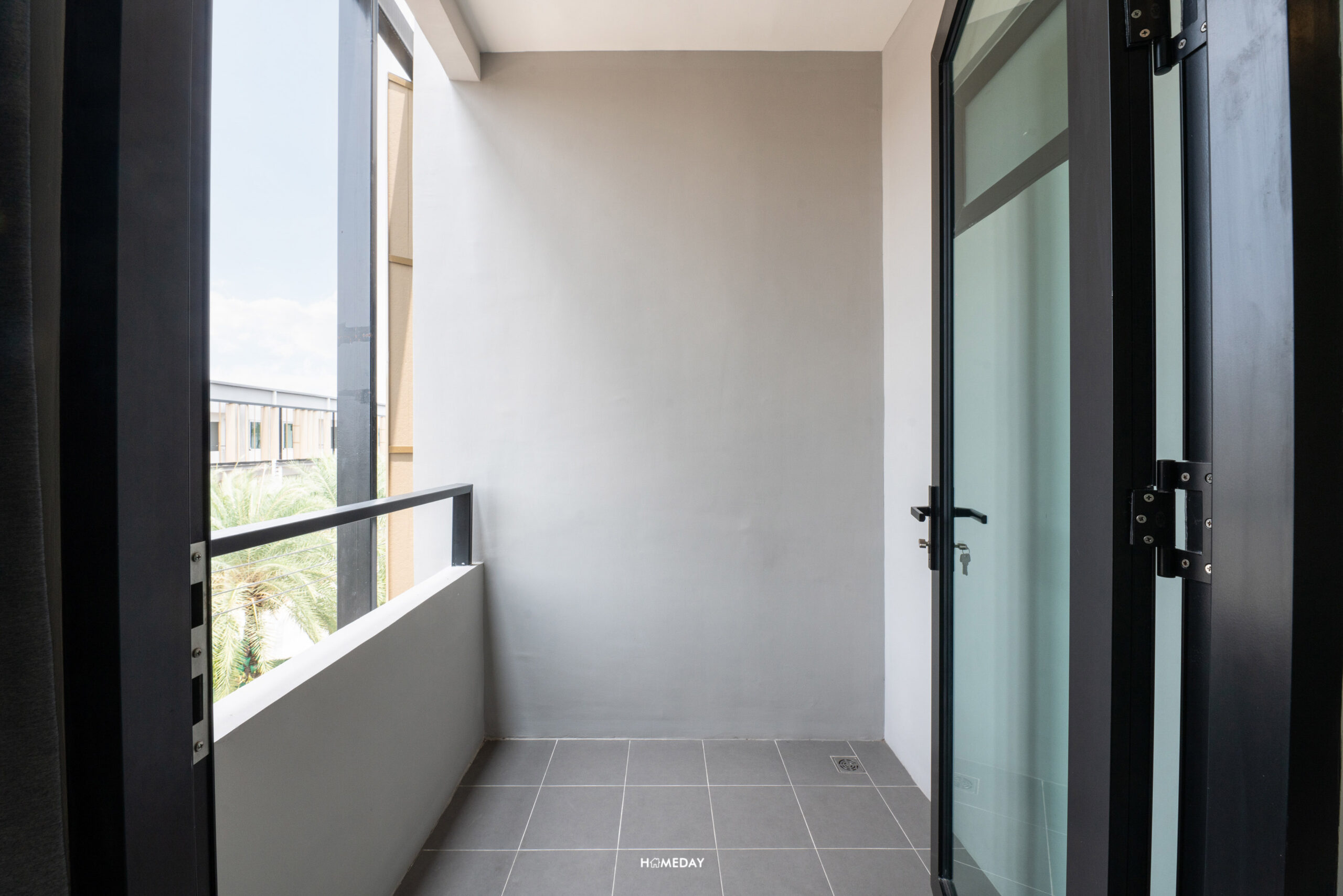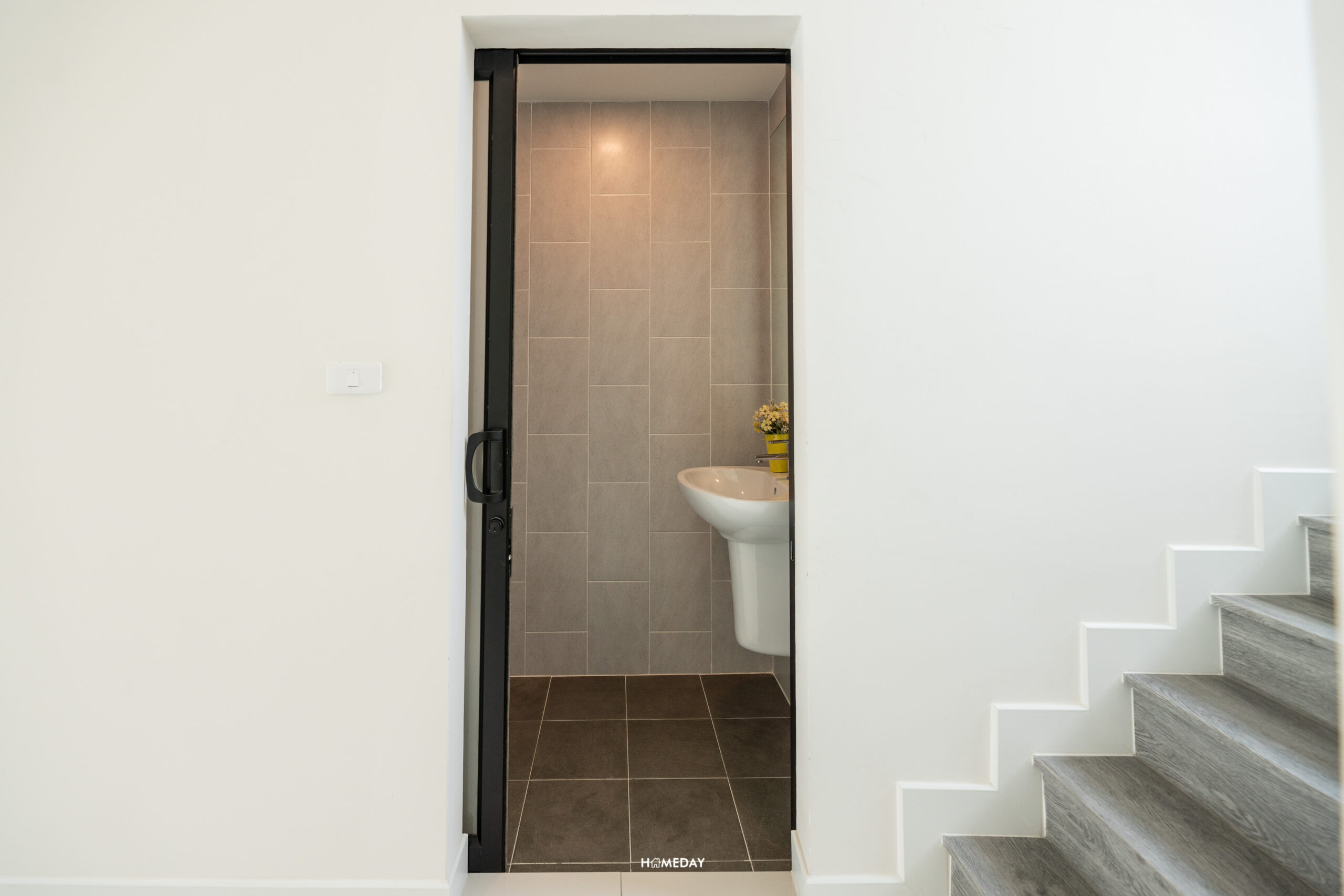 ทางขวามือจะได้เป็นห้องน้ำแบบ Powder Room อีก 1 ห้อง ส่วนระเบียงได้ประตูบานเลื่อนแบบเปิดตรงกลาง มีความสูง 2.8 เมตร เหมือนกันกับชั้นล่างเลยครับ มองออกไปนอกระเบียงจะเป็นฝั่งหน้าบ้าน ราวกันตกเป็นกระจก Tempered Glass ตัดด้วยกรอบอะลูมิเนียมสีดำ สไตล์ลอฟท์ สามารถปลูกต้นไม้เพิ่มมุมสีเขียวให้กับชั้น 2 ได้เลย