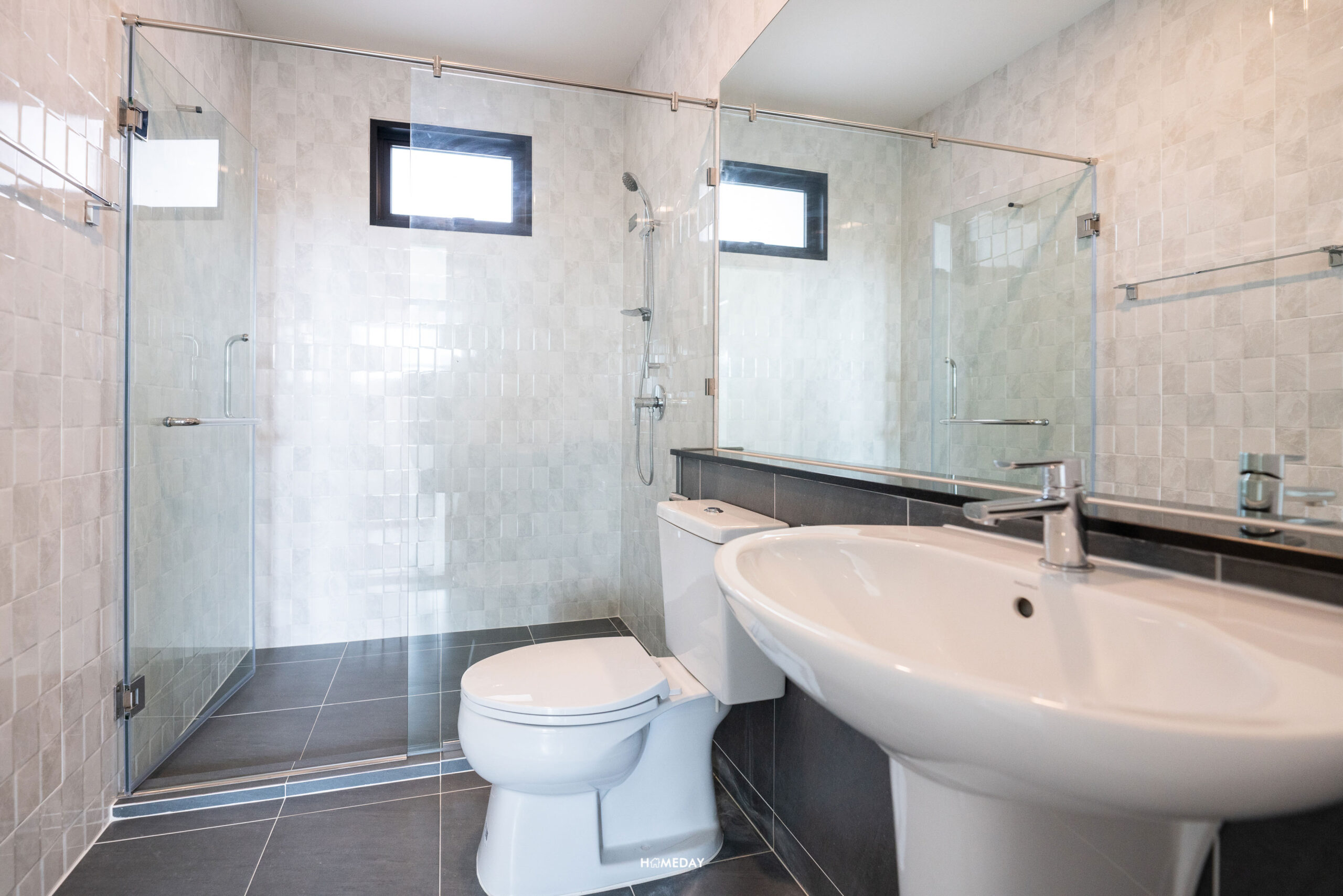 ส่วนห้องน้ำชั้น 3 ห้องนี้จะเป็นห้องน้ำเต็มรูปแบบ สำหรับใช้งานส่วนตัว ภายในจะแบ่งแยกส่วนแห้งและส่วนเปียก ด้วยฉากกั้นอาบน้ำกระจก Tempered Glass ภายใน Shower Box มีระยะใช้งานได้สบาย ๆ ให้ฝักบัว Hand Shower พร้อมราวปรับระดับ และที่ผนังมีการเดินระบบไฟฟ้า รองรับการติดตั้งเครื่องทำน้ำอุ่นเอาไว้ให้ ส่วนพื้นที่แห้งทางโครงการทำ Low Wall ไว้วางพวกขวดสบู่เหลว แชมพู สครับผิว หรือเครื่องหอมไว้อยู่ด้านหลังอ่างล้างหน้าและโถสุขภัณฑ์ ขนาดเพียงพอกับการใช้งานครับ
