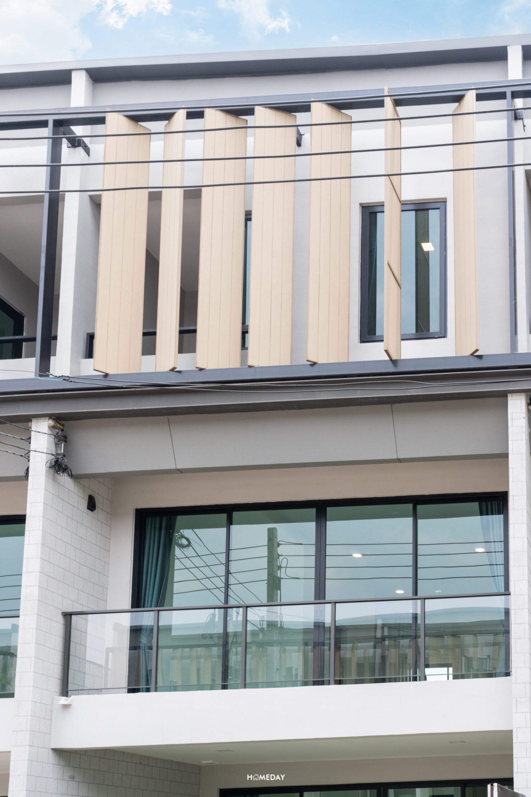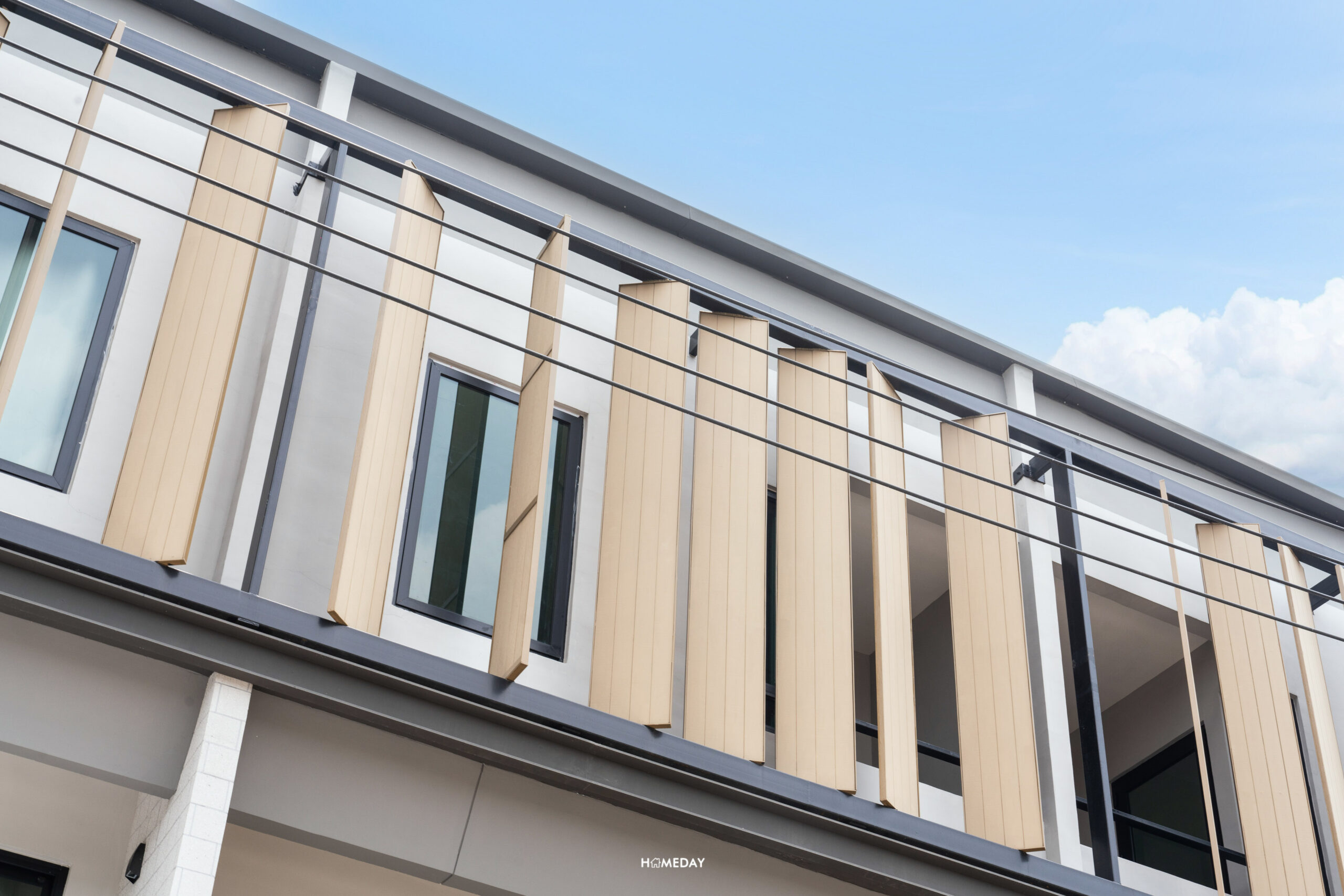 มองขึ้นไปชั้น 3 จะ มีแผงระแนงไม้สังเคราะห์ ช่วยลดความร้อนจากแสงแดด และเพิ่มความเป็นส่วนตัวให้กับ Master Bedroom ได้อีกด้วย