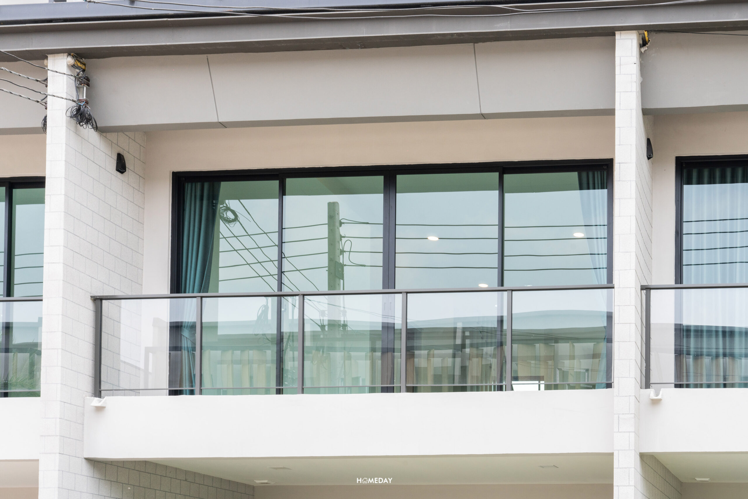ส่วนระเบียงชั้น 2 ราวระเบียงจะเป็นกระจกนิรภัย Tempered Glass เพิ่มความเป็นสไตล์ลอฟท์ด้วยกรอบอะลูมิเนียมสีดำ สามารถแทรกความเป็นธรรมชาติด้วยการปลูกต้นไม้มงคลรับทรัพย์เพิ่มพื้นที่สีเขียว สร้างบรรยากาศใกล้ชิดธรรมชาติให้กับธุรกิจและผู้อยู่อาศัยได้ด้วยครับ