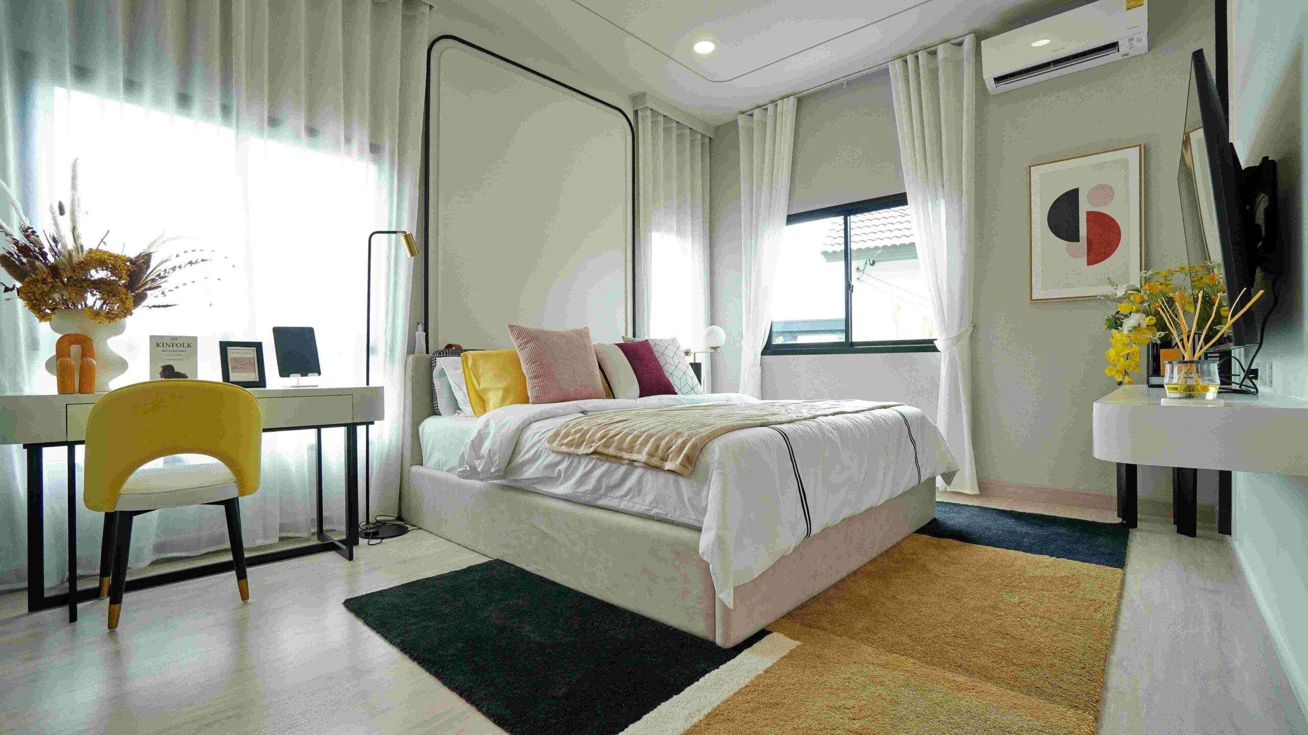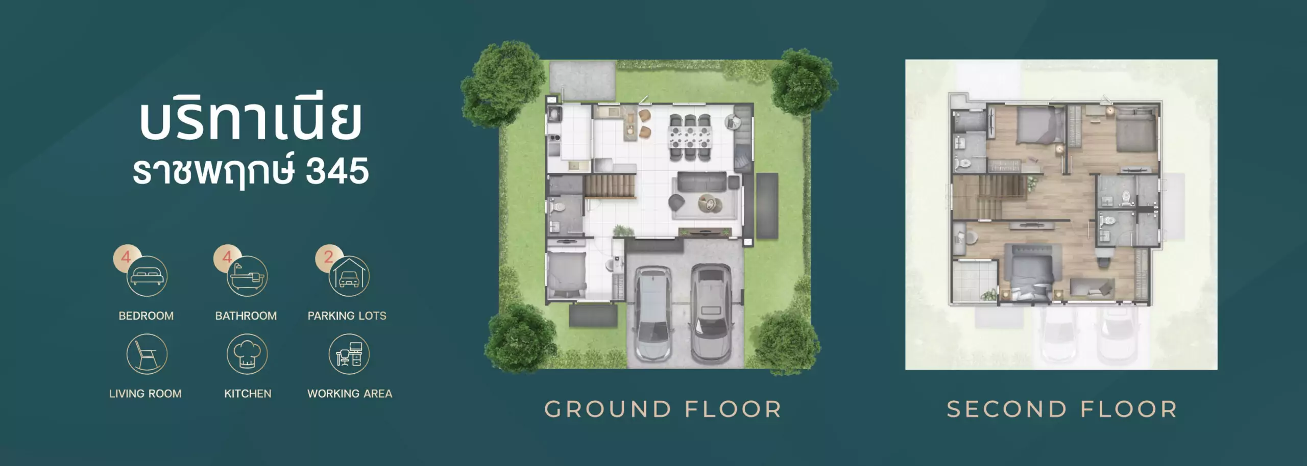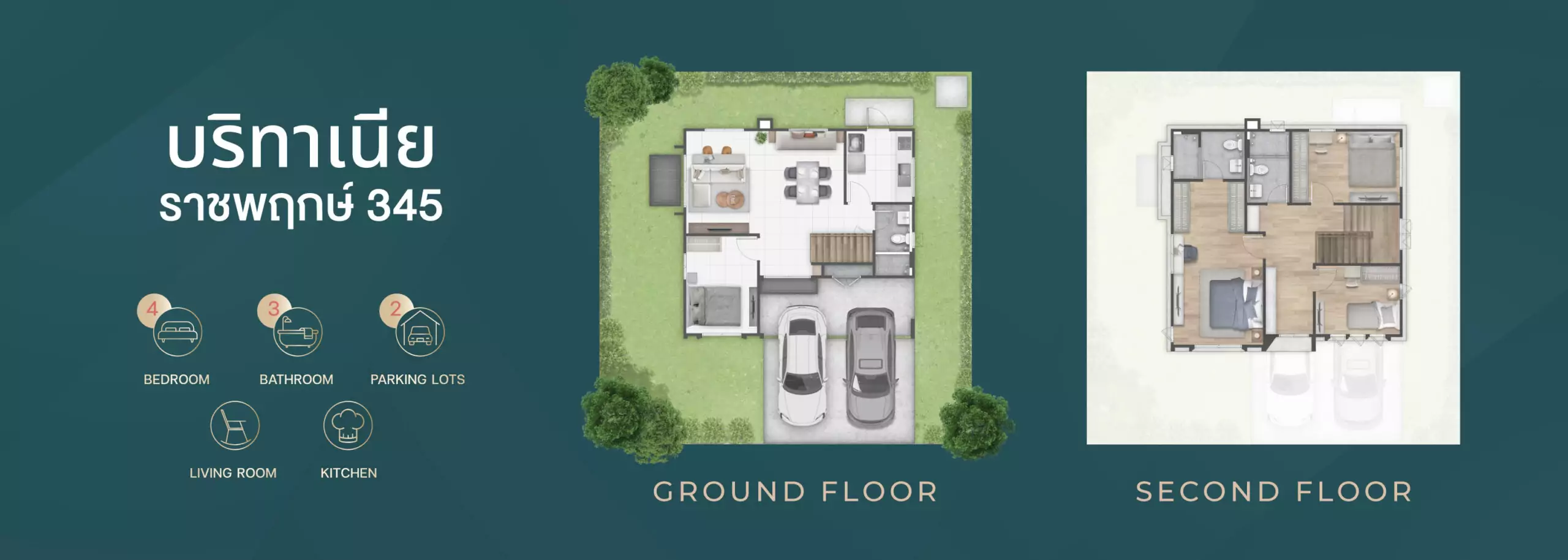 สถานศึกษาโรงเรียนสารสาสน์วิเทศร่มเกล้า การเดินทางมอเตอร์เวย์ด่านทับช้างรถไฟฟ้าสายสีส้มARL ลาดกระบังสนามบินสุวรรณภูมิ แบบบ้าน : Malinda พื้นที่ใช้สอย 245 ตร.ม. 4 ห้องนอน 5 ห้องน้ำ ห้องแม่บ้าน ที่จอดรถ 3 คัน