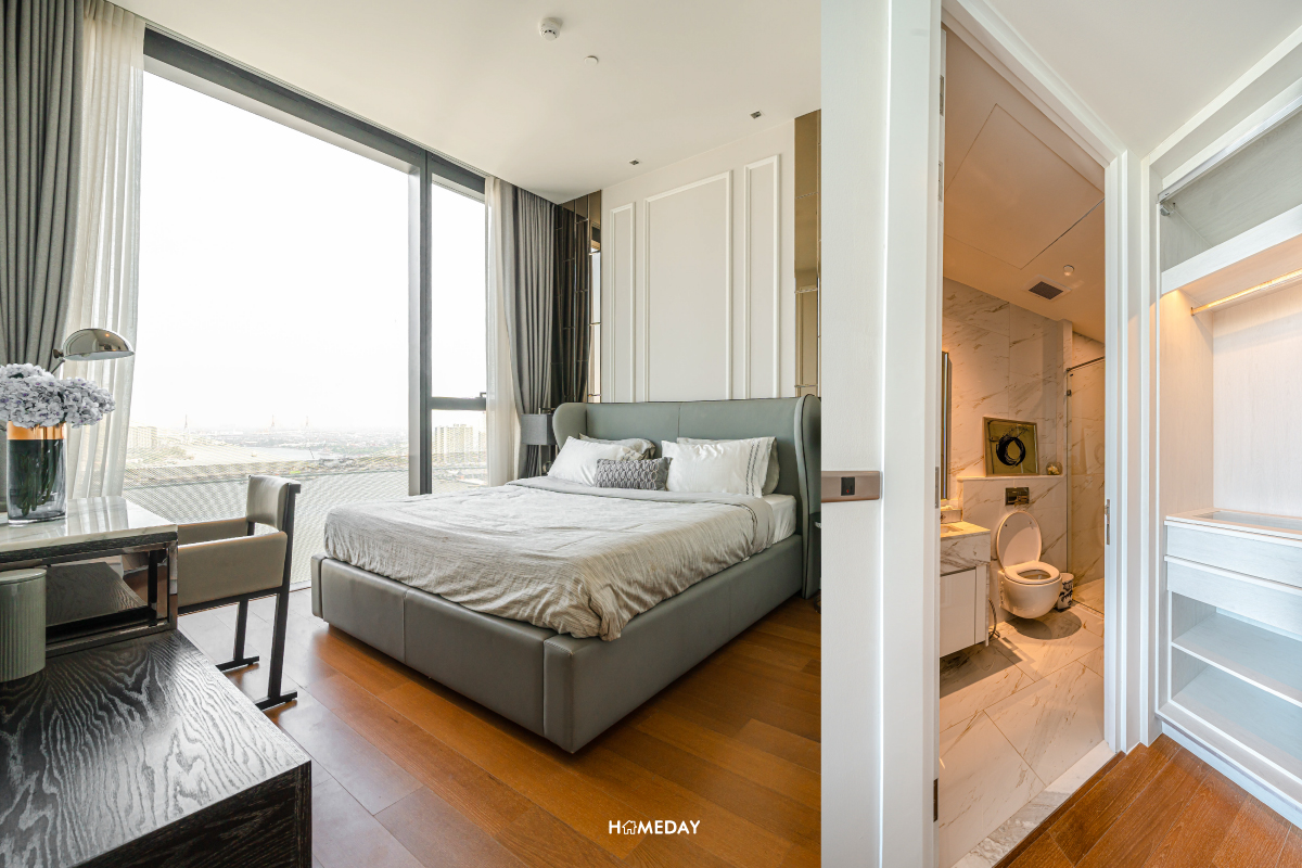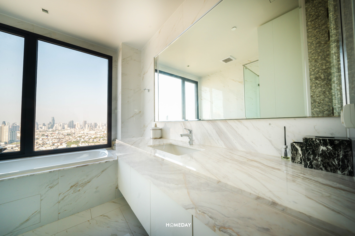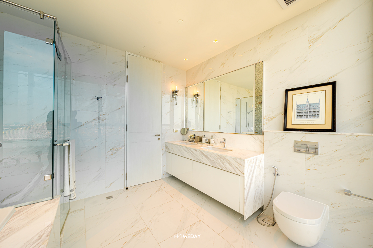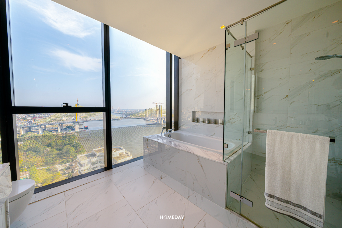 ทางด้านของห้องน้ำในตัว สำหรับ Master Bedroom นั้น อ่างล้างหน้าออกแบบสำหรับ His&Her ในช่วงเวลาเร่งด่วนยามเช้า ทั้งคุณผู้ชายและคุณผู้หญิงก็สามารถแยกใช้งานพร้อมกันได้อย่างสะดวก อ่างอาบน้ำและส่วน Shower อยู่แยกกันเป็นสัดส่วนอีกเช่นกัน ที่สำคัญคือในช่วงเวลากลางวันนั้น ห้องน้ำไม่จำเป็นต้องเปิดไฟเพื่อใช้งานเลยครับ เพราะภายในได้กระจกรับวิวมาบานใหญ่จัดเต็ม ในช่วงเวลาหลังเลิกงานก็สามารถมาแช่น้ำผ่อนคลาย ชมวิวเจ้าพระยายามค่ำคืนได้เลย