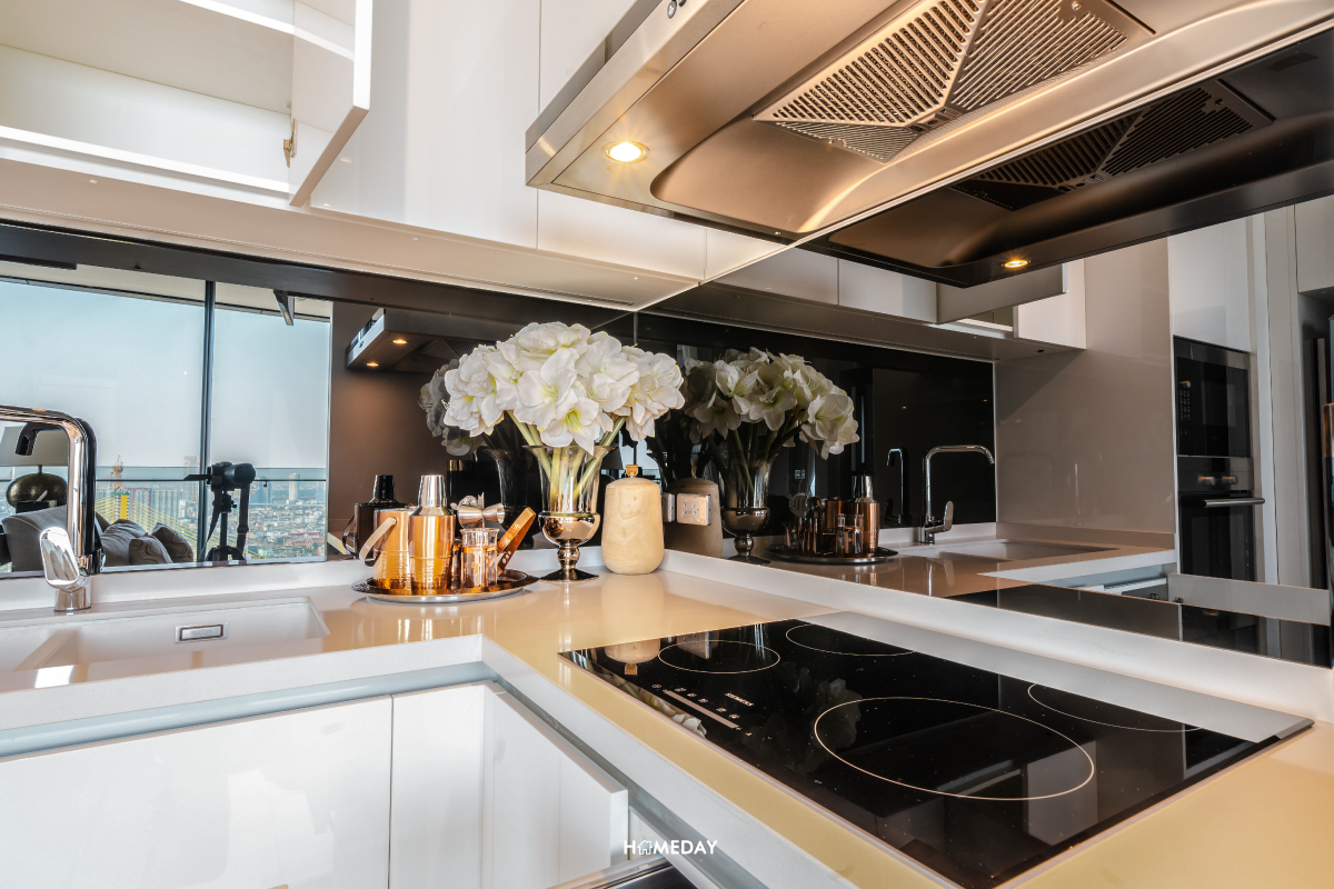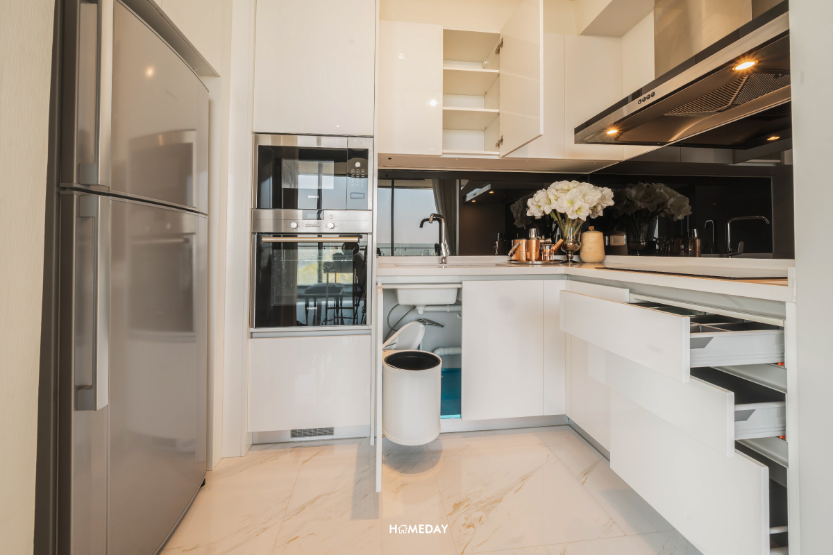 ครัวของห้องนี้เป็นลักษณะของครัวเปิดอีกเช่นกัน เป็นเคาน์เตอร์เข้ามุมตัว L มีพื้นที่เก็บของให้ทั้งด้านใต้เคาน์เตอร์และด้านบนในส่วนของตู้แขวนผนังบิลต์อิน ซ้ายมือดรอปช่องสำหรับใส่ตู้เย็นเอาไว้ให้ด้วยครับ ได้ความเป็นสัดส่วนและเป็นระเบียบเรียบร้อยทีเดียวครับ