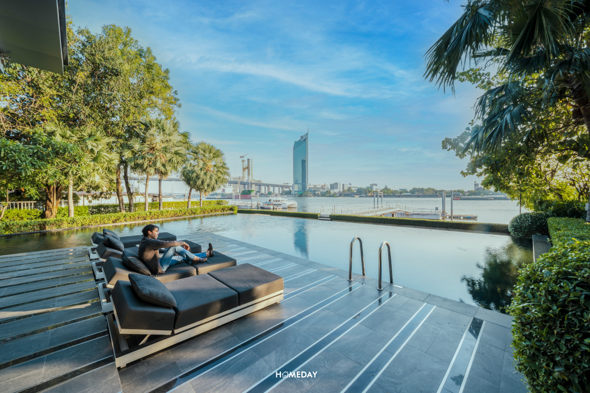 นอกจากจะมีพื้นที่นั่งเล่นแล้ว ยังมีส่วนของห้องประชุมอยู่ด้านในอีกด้วย สามารถเข้ามาใช้งานในการจัดประชุม ทำงาน ได้อย่างเต็มที่ครับ ส่วน Outdoor ของ Clubhouse จะเป็นมุมเอนกายและสระว่ายน้ำ มองออกไปรับวิวแม่น้ำเจ้าพระยาสวย ๆ และท่าเรือส่วนตัวของทางโครงการได้เลยครับ